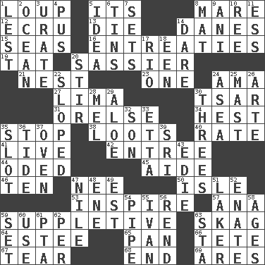 ACROSS 1. Central Nebraska county 5. ___ a Wonderful Life 8. Female horse 12. Shade of tan 13. Pass on 14. Natives or inhabitants of Denmark 15. Oceans 16. Pleas 19. Make lace 20. More disrespectful 21. Egg locale 23. Single 24. Nursemaid (var.) 27. Pale green bean 30. Russian ruler of old 31. Threatening words 34. Behest 35. Close up, plug up 38. Plunders 40. Assign a rank or rating to 41. Moving, as bait 42. Main course 44. Wrote a lyric poem 45. Assistant 46. Nine, plus one 47. Born 50. Capri or Wight 53. Heighten or intensify 57. Santa ___, CA 59. Supplying deficiencies 63. Heroin 64. First name in cosmetics 65. Baking dish 66. False hair 67. Pull into pieces 68. Conclusion 69. Ancient Greek god of war DOWN 1. For fear that 2. Sea 3. A salt of uric acid 4. Fluid product of inflammation 5. The content of cognition 6. Metal containers 7. Puts into a specified state 8. Floor protector 9. Black tropical American cuckoo 10. To riddle 11. Double-curved letter 14. Have the gumption 17. _ de Janeiro 18. Car or cant ending 20. Tumult 22. Inclined 24. At sea 25. Vertical spar for supporting sails 26. Johnson of "Laugh-In" 28. Cartoonist voice _ Blanc 29. Medicinal plant 30. Triplets 32. Manchild 33. Singer James 35. Position in a hierarchy or organization 36. Periodic rise and fall of the sea level 37. Baking chamber 39. Indian title of respect (Mr.) 43. Singer Brickell 47. "Death on the ____" 48. Compass dir. 49. Eastern Standard Time (abbr.) 51. Member of a famous L.A. basketball team 52. Related on the mother's side 54. Corncob 55. _ the terrible 56. Tear apart 58. Grows older 59. Put into a specified state 60. Purpose 61. Parent Teacher Association (abbr.) 62. For each 63. R.R. building