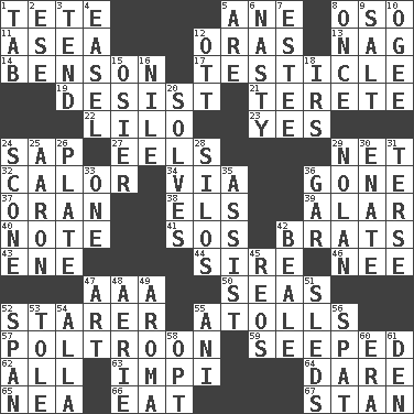 ACROSS 1. Wig 5. A saturated hydrocarbon 8. Bear (Spanish) 11. At sea 12. Mouths or openings 13. Tired old horse 14. Gillaume's butler role 17. A testis 19. Cease 21. Cylindrical with tapered ends 22. _ and Stitch 23. Affirmative reply 24. Plant excrement 27. Snakelike fish 29. Remaining after all deductions 32. Bodily heat indicating an inflammation 34. By way of 36. Went 37. NW Algerian seaport 38. Raised railways 39. Having or resembling wings 40. Brief written record 41. Mayday 42. Naughty children 43. Compass dir. 44. Beget 46. Born 47. Auto club (abbr.) 50. Oceans 52. A viewer who gazes fixedly 55. Ringlike coral islands and reefs 57. Characterized by complete cowardliness 59. Oozed 62. Everything 63. Body of Kaffir warriors 64. Have the gumption 65. Teachers' org. 66. Erode 67. Comedian Laurel of Laurel & Hardy DOWN 1. Keyboard key 2. Compass dir. 3. Watch over 4. Artist's stand 5. "We ___ not amused" (Victoria) 6. Characterized by obscenity 7. First name in cosmetics 8. Single time 9. Table seasoning 10. Double curve, resembling the letter S 12. Baseball player Mel 15. Flexible twig of a willow tree 16. "Death on the ____" 18. Big collection agency 20. Finds the solution 24. Biscuitlike quick bread 25. Composer Copland 26. Food holder 28. Grain storage towers 29. Pitcher Ryan 30. Related on the mother's side 31. Laconic 33. Single 35. Aid 36. Slender fish 42. Memphis, Tenn. Street 45. Vintage cars 47. Nonscientific branch of learning 48. Nest on high 49. Odor 51. Bobsleighs 52. Connect, as a bridge 53. Lacquered or enameled metalware 54. Silent film actress Nazimova 55. Black tropical American cuckoo 56. Argument over a trivial matter 58. Choose 60. Epoch 61. Lair
