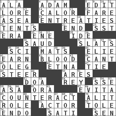 ACROSS 1. Chicken ___ king 4. First of billions? 8. Prepare for publication 12. Old wives' tales, e.g. 14. Bodily heat indicating an inflammation 16. Conductor's collection 17. At sea 18. Pleas 20. Portable shelters 22. Conclude 23. Fast jet (abbr.) 24. Period 25. Compass dir. 28. Binary compound 30. Saudi Arabian king (1953-1964) 31. Narrow boards 35. _-fi 37. Floor protectors 40. Writer Wiesel 41. Merit 42. Vital fluid 44. Patter 45. Cassini of fashion 46. Inactive volcano in Sicily 47. Neckwear 48. Navigate 50. Ancient Greek god of war 52. ___ good deed 54. Marina Del _, California 55. Compass dir. 58. White ___ sheet 61. Mouth or opening 63. Webber/Rice musical 65. Frustrate 70. Came down and settled, as after flight 71. Hero or heavy, e.g. 72. Thespian 73. Lacquered or enameled metalware 74. Inside; within (prefix) 75. Suttee (variant) 76. Elected rep. DOWN 1. Having winglike extensions 2. Failure 3. Sports stadium 4. Adept person 5. Daniel's nick name 6. Keyboard modifier key 7. Greater amount 8. Bank Draft (abbr.) 9. Raised platform 10. Angers 11. Trial 13. Consume 15. Painter Guido (1575-1642) 19. Does sums 21. Ocean 26. Unfeeling 27. Peak District village in England 29. Opts 30. Scorched 32. Jai _ 33. Prong on a fork 34. Arrange properly for use 35. Table seasoning 36. Algonquian 38. Small child 39. Echolocation 41. Greek goddess of the dawn 43. Have the gumption 49. Carrot, for example 51. Sight organ 53. Type of rug 55. Grain storage towers 56. Vertical member of a panel or frame 57. Eroded 58. Land measure 59. Within a short period 60. Old (Scot.) 62. Curves 64. Large container 66. Modern: prefix 67. "One Day ___ Time" 68. Small bed 69. Three (prefix)