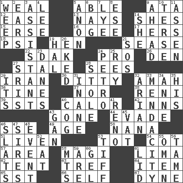 ACROSS 1. Welt 5. Competent 9. "One Day ___ Time" 12. Comfort 13. Negative votes 14. "______ My Girl" (Turtles hit) 15. Celtic language 16. Double curve, resembling the letter S 17. Possessive pronoun 18. Air pressure measure (abbr.) 19. Layer 21. Gospel singer Marvin 22. Neighbor of Neb. 24. Adept person 26. Lair 27. Showing deterioration from age 28. Perceives with the eye 29. SW Asia republic 30. Short, simple song 32. Nursemaid 36. Prong on a fork 37. Not either 38. Painter Guido (1575-1642) 39. Fast planes 40. Bodily heat indicating an inflammation 42. Restaurants 43. Went 44. Elude 46. Compass dir. 49. Mature 50. Grandmother 51. Make or become more lively 53. Small child 54. Small bed 57. Type of rug 58. Wise men 61. Pale green bean 62. Portable shelter 63. Unclean, religiously 64. Detail 65. Fast jet (abbr.) 66. Automatic 67. Centimeter-gram-second unit of force DOWN 1. Shed a tear 2. Hearing organs 3. Helper 4. Area sheltered from the wind 5. At once, immediately (arch.) 6. Container for groceries 7. Potassium hydroxide 8. Compass dir. 9. Toward the future 10. Laconic 11. NE Netherlands city 14. A female animal or person 19. Actor Linden 20. Supplemented with great effort 21. Mayday 23. Natives or inhabitants of Denmark 24. Stone: prefix 25. Marina Del _, California 27. Indian titles of respect 28. Fur scarf 29. ___ a Wonderful Life 31. Empty; void 32. Believer in; advocate of (suffix) 33. Ananias' fault 34. Queen of England 1702-14 35. Part of HMS, perhaps 40. Gear tooth 41. Former U.S. Attorney General Janet 43. Separate the seeds from cotton 45. Large container 46. Narrow boards 47. Titles for men of rank and authority 48. Incident 52. Erode 53. Small quarrel 55. Sign of something about to happen 56. Docile 58. Mountains (abbr.) 59. "We ___ not amused" (Victoria) 60. Set 61. Hat (slang)