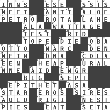 ACROSS 1. Restaurants 5. Compass dir. 8. Fast planes 12. Rendezvous 13. Against 15. _ vera 16. Stone: prefix 18. Roll call or roster of names 19. Unable to walk 20. According to 22. Electrical Measurement 24. Trial 26. To free from 27. Drink excessively 28. Pass on 29. Chief or king in Benin or Nigeria 32. "Beetle Bailey" pooch 35. Drug cop 37. Lair 38. Chow _ 39. Heredity factor (abbr.) 40. Root beer relative 41. Car or cant ending 42. Pile 43. Mountain range 44. Compass dir. 45. Help 46. Engineer (abbr.) 49. Massive 50. Back-to-school mo. 51. Curse 55. White ___ sheet 56. Play the lead 57. Greek god of love 59. Begets 63. Old (Scot.) 64. Swiss mountan, "Queen of the Mountains" 65. Egg locale 66. Sliced desserts 67. Erode 68. Bristle DOWN 1. Naughty child 2. Born 3. Remaining after all deductions 4. Ski resort town in Vermont 5. Ewer handle 6. Overwhelm 7. Singer James 8. Vegetable dish 9. Volcanic refuse 10. Heavy book 11. Observe 14. Of or pertaining to medicine 17. Margarine 21. Cleo's killer 23. Standoff 25. Looked after 28. Window treatments 29. Aroma 30. Actor Lugosi 31. Of or related to the anus 32. Presage 33. Adolescent 34. Prong on a fork 36. Santa ___, CA 40. Window treatments 42. Having greater elevation 45. Small island 47. Teachers' org. 48. Global Positioning Systems (abbr.) 49. Avian creatures 51. Needle holder 52. Light colored 53. One of the Great Lakes 54. Ancient Roman robe 56. Plant excrement 58. Be seated 60. To sift 61. Eastern Standard Time (abbr.) 62. R.R. building