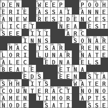 ACROSS 1. Lair 4. Shed a tear 8. "Silly old bear" 12. One of the Great Lakes 14. Slender Brazilian palm 16. Singer Murray 17. Afresh 18. Dwellings 20. It is permitted: Lat. 22. Teachers' org. 23. Eastern Standard Time (abbr.) 24. Perceive with the eye 25. One more than two 28. Curve 30. Lodging establishments 31. Underwater navigation system 35. Big _ 37. Russian ruler of old 40. French philosopher Descartes 41. Australian parrot (variant) 42. Type of eclipse 44. Nathan's nickname 45. Actor Baldwin 46. Pulitzer Prize-winning author Ferber 47. Raised railways 48. Calif. Air Force Base 50. Inactive volcano in Sicily 52. Begley and Asner 54. Car or cant ending 55. R.R. building 58. Quiet! 61. It is 63. Wetness 65. Neutralize 70. Words to Nanette 71. So be it 72. Southeast Indonesia island 73. Flats, for short 74. Connecting point 75. Suttee (variant) 76. Compass dir. DOWN 1. Allots cards 2. Bert's buddy 3. Sibling's daughter 4. Armed conflict 5. Compass dir. 6. Curvy letter 7. Ache 8. Baking dish 9. Single time 10. Singles 11. Command 13. She-sheep 15. The content of cognition 19. Hearing organs 21. Metal container 26. International (abbr.) 27. Come out of 29. Pupil covering 30. Ice on the eave 32. Anneal 33. Pismires 34. To separate or throw off 35. Undercover agent 36. Type of rug 38. Plus 39. Indian princess (variant) 41. Experiment locale 43. Pace 49. Prepare for publication 51. Compass dir. 53. Proofreading order 55. Closes up, plugs up 56. Portable shelters 57. Came up 58. Examine minutely or intensely 59. Like (prefix) 60. Became colored 62. Indian titles of respect 64. Santa ___, CA 66. Compass dir. 67. Housemaid (var.) 68. Small bed 69. Three (prefix)