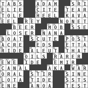 ACROSS 1. Bar bills 5. First of billions? 9. _ Lanka 12. Writer Wiesel 13. Quote 14. Pull into pieces 15. Lacquered or enameled metalware 16. Person who is morally reprehensible 17. Polynesian shrub of the pepper family 18. Snakelike fish 19. Marina Del _, California 21. Music written for nine 22. Fermented drink made from hops 24. Crowd into 26. Compass dir. 27. Failure 28. Nanny 29. Water vessel 30. Turtle shell scale 32. Mail 36. 43,560 square feet 37. Begley and Asner 38. Singer James 39. Travel on an animal 40. Native American of Southwest Alaska 42. Not this but _ 43. Lubricates 44. More uncommon 46. She-sheep 49. Binary compound 50. Independent ruler or chieftain 51. Lessep's creation 53. Alias (abbr.) 54. Armed conflict 57. Relating to the mouth 58. Commotion 61. Trig term 62. Globular water bottle used in Asia 63. Event that recurs at intervals 64. Fast planes 65. Compass dir. 66. Small Philippine buffalo 67. Trial DOWN 1. False hair 2. _ vera 3. Big road sign 4. Perceive with the eye 5. Painful 6. Expire 7. Had dinner 8. Cartoonist voice _ Blanc 9. Actors Connery and Penn 10. All-night dance parties 11. Feeling or showing extreme anger 14. Ring climax 19. Portuguese money of account (variant) 20. Blunders 21. Basketball assoc. 23. First name in cosmetics 24. Taiwanese island in East China Sea 25. Single 27. Event scenes 28. Unclothed pictures 29. Oblong piece of solid material 31. Cell (Danish) 32. _ dish (used to culture cells) 33. Else 34. Play the lead 35. Make lace 40. Assist 41. Long journey 43. Petroleum 45. Nanny (var.) 46. Learning spot: Fr. 47. Make _____ (do battle with) 48. Maternal 52. Insect wing 53. Type of rug 55. Pismires 56. Take ten 58. R.R. building 59. Shallow baking pan 60. Wedding promise 61. Fast jet (abbr.)