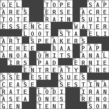ACROSS 1. Set 4. Drink excessively 8. Plant excrement 11. Ancient Greek god of war 13. Celtic language 14. 1/640 square mile 15. Carryall 16. Precipitation 17. Costume for a special activity 18. Gist 21. Wetness 22. Spoils 23. R.R. building 25. Biblical high priest 26. Tate display 29. Orators 32. Giggle 34. Sound made by sheep 35. Infant food 38. Small Philippine buffalo 39. Leaves out 41. Of or related to the anus 43. Big collection agency 44. Writing tablet 45. Bert's buddy 46. Plea 50. Compass dir. 51. Compass dir. 54. Compass dir. 55. Institutes legal proceedings 57. Stop 59. French poetic form 63. Assign a rank or rating to 64. Farming town in central California 67. SW Asia republic 68. At sea 69. Washington bills 70. Former U.S. Attorney General Janet 71. Commissioned military rank (abbr.) 72. Portable shelter 73. Male child DOWN 1. Yard entry 2. Greek god of love 3. Allows 4. Cigar-shaped 5. Mouth or opening 6. Air pressure measure (abbr.) 7. Car or cant ending 8. Turtle shell scale 9. Satellite of Uranus 10. _ dish (used to culture cells) 12. Sew up the eyelids of hawks and falcons 14. White ___ sheet 19. Olfactory organ 20. Police officer (slang) 21. Armed conflict 23. Three-handed card game 24. Beverages made from leaves 26. "One Day ___ Time" 27. Painter Guido (1575-1642) 28. Son of Odin 30. Stay 31. Practice fight 33. Comfort 36. Singer Murray 37. Ache 39. Elects 40. Female horse 42. Area sheltered from the wind 45. Sight organs 47. Born 48. Help 49. Third day of the wk. 51. Lean end of the neck 52. Gospel singer Marvin 53. Eroded 56. Move through with a circular motion 58. Ocean 60. Angers 61. Billionth: prefix 62. Soon (poet.) 64. Car dealer's back yard 65. Single 66. Lair