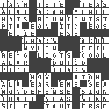 ACROSS 1. Hyperbolic tangent 5. Wig 9. Afternoon social gatherings 13. Jai ____ 14. The sixth month of the Jewish calendar 15. Haggard of country music 16. Floor coverings 17. One who advocates reunion 19. Parent Teacher Association (abbr.) 20. A really long time 21. It would 22. Greek goddess of the dawn 23. Writer Wiesel 25. Compass dir. 26. Seizes 30. 1/640 square mile 34. High-strength synthetic material 35. To provide with a ceiling 36. San ____ (Riviera town) 39. Plunders 42. Calm and collected 43. Having or resembling wings 44. Expenditure 46. Corncob 47. Pulls into pieces 48. Cut the grass 51. Tiny particle 54. Wing 57. Ewer handle 58. Followers of ems 60. Ocean 62. Unrelated to defense, as in spending 65. The Jewish people; Israel 66. Distinguishing feature 67. Oceans 68. Stitched 69. Filth; sediment 70. Tense 71. Celtic language DOWN 1. Pack (down) 2. Having winglike extensions 3. Brizilian seaport 4. Part of HMS, perhaps 5. Edible starchy tuberous root 6. Locale of original sin 7. The 19th letter of the Greek alphabet 8. Bert's buddy 9. "___ Little Indians" 10. 4th largest of the Great Lakes 11. In addition 12. Arranges properly for use 15. Method 18. ___ a Wonderful Life 20. Suggestive of the supernatural 24. Dismiss 27. Everything 28. Surprise greeting 29. Snob 30. Buttonhole 31. Corporate head (abbr.) 32. River (Sp.) 33. Pipe bend 36. Reproach for some lapse or misdeed 37. Biblical high priest 38. Atlas unit 40. Third day of the wk. 41. R.R. building 45. Pate de foie ____ 48. Confront 49. Clumsy lout 50. Obtain by seizing forcibly or violently 52. Flexible twig of a willow tree 53. Catcalls? 54. Pismires 55. Australian parrot (variant) 56. Of or related to the anus 58. Son of Isaac 59. Egg locale 61. Singer Murray 63. Pass on 64. Teachers' org. 65. Compass dir.
