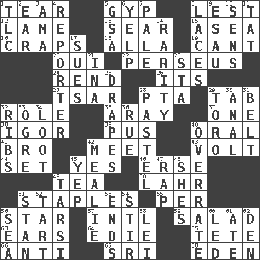 ACROSS 1. Lacerate 5. Flimflam 8. For fear that 12. Unable to walk 13. Wither 15. Toward the sea 16. Dice game 18. Silent film actress Nazimova 19. Patter 20. Fr. "Yes" 22. Son of Zeus who helped slay Medusa 24. Tear apart 26. It is 27. Russian ruler of old 28. Parent Teacher Assoc. 29. Keyboard key 32. Hero or heavy, e.g. 35. Like ___ of sunshine 37. Single 38. Russian composer Stravinsky 39. Fluid product of inflammation 40. Taken by mouth 41. Sis' sibling 42. Rendezvous 43. Electrical Unit 44. Arrange properly for use 45. It is so 46. Celtic language 49. Beverage made from leaves 50. Cowardly lion portrayer 51. Paper fasteners 55. For each 56. Play the lead 57. International (abbr.) 59. First course 63. Hearing organs 64. Singer Brickell 65. False hair 66. Against 67. Indian title of respect (Mr.) 68. Paradise DOWN 1. Affectionate concern, for short 2. Ewer handle 3. Housemaid (var.) 4. Newsperson 5. Girls' org. (abbr.) 6. Sharp bark 7. Diluted with white 8. Shoestrings 9. Son of Isaac 10. Elected reps. 11. Make lace 14. Noteworthy scarcity 17. Institutes legal proceedings 21. _ tizzy (2 wds.) 23. R.R. building 25. Window treatments 28. Soft color 29. "Corrida" creature 30. Of or related to the anus 31. Waist strap 32. Teases 33. Legendary monster 34. Plunder 36. Sorrow 40. Make much ado about nothing 42. Ear of corn 45. Slangy assent 47. Reproach for some lapse or misdeed 48. "______ My Girl" (Turtles hit) 49. Tarsus (plural) 51. Comedian Laurel of Laurel & Hardy 52. Small pie 53. Extremities 54. Tumult 56. Ocean 58. Luau accessory 60. Directed 61. Had dinner 62. Lair