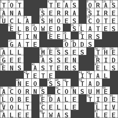 ACROSS 1. Small child 4. Beverages made from leaves 8. Mouths or openings 12. Santa ___, CA 13. Spanish missionary in California 14. The founder of a family 15. Southern CA. univ. 17. Imelda's hoard 18. ____ d'Azur (French Riviera) 19. Turned at an angle; bent 21. Chalkboards 23. Metal container 24. Snakelike fish 26. Big collection agency 27. Yard entry 28. Probability 30. Everything 31. Makes clutter 34. Definite Article 37. Turn to the right 38. NE Netherlands city 39. To free from 40. Followers of ems 41. Michaelmas daisies 42. Raised railways 43. Wig 44. Slanted text style (abbr.) 46. Modern: prefix 47. Fast jet (abbr.) 50. Bit 51. Oak nuts 54. Ingest 57. Ear part 58. Peak District village in England 60. Event that recurs at intervals 62. Electrical Unit 63. Cell (Danish) 64. 54 in ancient Rome 65. Toward shelter 66. It was, poetically 67. Area sheltered from the wind DOWN 1. The 19th letter of the Greek alphabet 2. At one time in the past 3. Baron Munchausen's specialties 4. Giggle 5. Wear away 6. "We ___ not amused" (Victoria) 7. Backtalk 8. Motion picture awards 9. Disturbances 10. Johnson of "Laugh-In" 11. Perceives with the eye 13. Compass dir. 16. "This won't hurt ____!" 20. Single 22. Hats (slang) 25. Failure 27. Small, secluded valley 29. Hiding places for outlaws 30. Grow older 31. Vertical spar for supporting sails 32. _____ Park, CO 33. Compass dir. 34. Excercise machine 35. Land elevation 36. Begley and Asner 41. A really long time 43. Cigar-shaped 44. ___ a Wonderful Life 45. Drawn tight 46. Impressive in appearance 48. Any of the three canals of the cochlea 49. For Whom the Bell _____ 51. Inventor's middle name 52. Calm and collected 53. Religious group 55. Born 56. Singer Brickell 59. Morning condensation 61. Night before a holiday