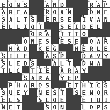 ACROSS 1. Immeasurably long periods of time 5. Added to 8. Hit sharply and swiftly 11. Length times width 12. Wander aimlessly 14. Single 15. Table seasonings 17. Celtic language 18. "Terrible" tsar 19. American author Paul (1891-1958) 21. Beer mug 23. Mouth or opening 25. "Tell ____ the Marines!" 26. Singles 27. Compass dir. 28. Boat paddle 31. Possessed 33. Cask 35. Haggard of country music 37. Filth; sediment 38. Viper 40. _ Jones' Locker 41. Bobsleighs 43. Keyboard modifier key 45. Heredity factor (abbr.) 46. Affectionate concern, for short 47. Make a knot 50. Like ___ of sunshine 52. "Two Mules for Sister ____" 53. Slangy assent 54. N Egypt peninsula 56. Principles of right and wrong 61. Chop _ 62. A home for chicks 65. Sir (Sp.) 66. Raised railways 67. _ gin 68. Needle case 69. Fish or hair follower 70. Manchild 71. Chops off DOWN 1. Relaxation 2. Taken by mouth 3. 1994 drama film starring Jodie Foster 4. Suttee (variant) 5. "We ___ not amused" (Victoria) 6. Not either 7. Small ungulate mammals of Africa 8. Be footloose 9. Of or related to the anus 10. Fenced enclosure 13. Confronts 16. Within a short period 18. Wedding promise 20. Long journey 22. Detail 24. At sea 26. Wrote a lyric poem 28. NW Algerian seaport 29. Inventor's middle name 30. Marina Del _, California 31. Land elevation 32. Actor Baldwin 34. Girls' org. (abbr.) 36. Whirlpool 37. Fast jet (abbr.) 39. Frolic 42. Play the lead 44. Relationship diagram 48. Removes the wrinkles 49. Artist's stands 51. Tenement units (abbr.) 52. Declare 54. Whimper 55. Behest 57. The bottom of a shoe or boot 58. To the inside or interior of 59. Clever action or accomplishment 60. Indian titles of respect 61. Elected rep. 63. "Barney Miller" actor Jack 64. "___ Little Indians"