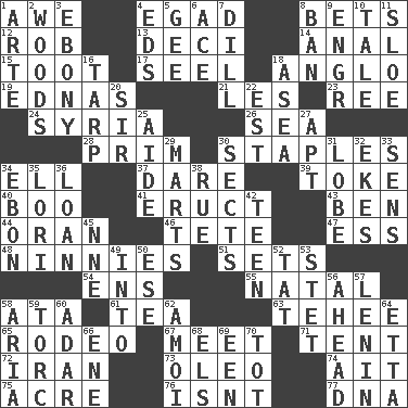 ACROSS 1. Deep reverence 4. Mild oath 8. Stakes 12. Director Reiner 13. Tenth: prefix 14. Of or related to the anus 15. A blast of a horn 17. Sew up the eyelids of hawks and falcons 18. White American of non-Hispanic descent 19. Ferber et al. 21. French article 23. To separate or throw off 24. Damascus' land 26. Ocean 28. Demure 30. Paper fasteners 34. Pipe bend 37. Have the gumption 39. Casino tip 40. Surprise greeting 41. Spew [out] 43. Benjamin's nick name 44. NW Algerian seaport 46. False hair 47. Double-curved letter 48. Fools 51. Puts into a specified state 54. Followers of ems 55. Brizilian seaport 58. "One Day ___ Time" 61. Beverage made from leaves 63. Giggle 65. Cowboy competition 67. Rendezvous 71. Portable shelter 72. SW Asia republic 73. Margarine 74. Small island 75. 43,560 square feet 76. Is not 77. Heredity factor (abbr.) DOWN 1. Johnson of "Laugh-In" 2. Forest 3. Black 4. Begley and Asner 5. Turn to the right 6. Adept person 7. Deli pickle 8. Bar 9. Engineer (abbr.) 10. Story 11. _ gin 16. Canvas cover 18. At sea 20. Title for a knight 22. Eastern Standard Time (abbr.) 25. Helper 27. Fitting 29. Shops 30. Religious groups 31. Ear part 32. Supplements with great effort 33. Elected reps. 34. Inky black, to poets 35. Australian parrot (variant) 36. Grant temporary use of 38. Regret 42. Adolescent 45. Compass dir. 49. To the inside or interior of 50. Compass dir. 52. Make lace 53. Proofreading order 56. At or in the front 57. Soviet premier 1918-24 58. Roberta Peters solo 59. Torque (variant) 60. The sixth month of the Jewish calendar 62. Mine, in Marseilles 64. Singer James 66. Compass dir. 68. Raised railways 69. Car or cant ending 70. Small child
