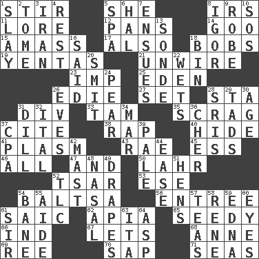 ACROSS 1. Agitate 5. A female animal or person 8. Big collection agency 11. Old wives' tales, e.g. 12. Zero-star reviews 14. Thick or sticky substance 15. Collect or gather 17. In addition 18. Moves up and down 19. Gossips 21. Undo the wiring of 23. Naughty child 25. Genesis locale 26. Singer Brickell 27. Arrange properly for use 28. R.R. building 31. HTML Container Element 33. Scottish cap 35. Lean end of the neck 37. Quote 38. Strike 40. Flintstone garb 41. Suffix with ecto or cyto 43. Actress Charlotte 45. Curvy letter 46. 100% 47. Also 50. Cowardly lion portrayer 52. Russian ruler of old 53. Compass dir. 54. Greek mezzo-soprano Agnes 56. Main course 61. Ketch in the Levant 62. Capital of Western Samoa 65. Shabby and untidy 66. Indiana (abbr.) 67. Allows 68. Singer Murray 69. To sift 70. Plant excrement 71. Oceans DOWN 1. Kill 2. Heavy book 3. SW Asia republic 4. Remainder 5. Health resort 6. Actor Linden 7. Takes place subsequently 8. Russian composer Stravinsky 9. Loose flowing garment 10. Distress signal 13. Message 16. Alleged 18. Storage container 20. Stricken, poetically 22. Moistens 24. Lightbulb-shaped fruit 26. Nights before holidays 28. Indian titles of respect 29. Small boys 30. Personal question 31. Deli pickle 32. Slanted text style (abbr.) 34. Spoil 36. "Mermaids" star 37. Numbers guy (abbr.) 39. Light colored 42. Vertical spar for supporting sails 44. Relaxation 48. Rhinal 49. Window treatments 51. Coop moms 52. Affectionate concern, for short 54. Object of repulsion 55. Assistant 57. Afternoon social gatherings 58. French philosopher Descartes 59. Pulitzer Prize-winning author Ferber 60. Sight organs 61. Title for a knight 63. Call ___ day 64. Cleo's killer