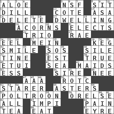 ACROSS 1. Medicinal plant 5. Science/research agcy. 8. Be seated 11. Deli pickle 12. ____ d'Azur (French Riviera) 13. White ___ sheet 14. Keyboard key 17. Residence 19. Oak nuts 21. Chooses 22. Musical group of three 23. Actress Charlotte 24. Snakelike fish 27. Chow _ 29. Barrel 32. Grin 34. Distress signal 36. Filth; sediment 37. Prong on a fork 38. Eastern Standard Time (abbr.) 39. Loyal 40. Needle case 41. Ocean 42. Women servants 43. Curvy letter 44. Title for a man of rank and authority 46. Born 47. American Automobile Association (abbr.) 50. College mil. group 52. A viewer who gazes fixedly 55. Michaelmas daisies 57. Coward 59. Threatening words 62. Everything 63. Body of Kaffir warriors 64. Ache 65. Beverage made from leaves 66. Ingest 67. Jane of fiction DOWN 1. Increase 2. Falsehood 3. Water jar 4. Choose 5. Immediately 6. Navigate 7. Chap (slang) 8. Ketch in the Levant 9. Is not 10. Labels 12. Music discs 15. Singer Mel 16. One of the Great Lakes 18. Area sheltered from the wind 20. Annoying sounds 24. First name in cosmetics 25. Sends forth 26. "_ and Lucy" (Charlie Brown theme song) 28. Olfactory organs 29. Japanese brewing company 30. Dodge 31. Honkers 33. Luau accessory 35. Flight of steps 36. R.R. building 42. Distance measurement 45. Printing process, for short 47. Nonscientific branch of learning 48. Nest on high 49. Odor 51. Streamer paper 52. Argument over a trivial matter 53. Lacquered or enameled metalware 54. Silent film actress Nazimova 55. Black tropical American cuckoo 56. Kill 58. Elect 60. Title for a knight 61. Compass dir.