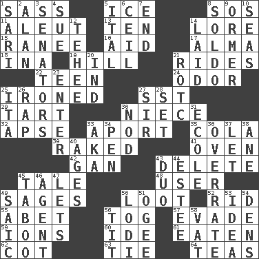 ACROSS 1. Backtalk 5. Frozen water 8. Mayday 11. Eskimo relative 13. "___ Little Indians" 14. Old wives' tales, e.g. 15. The wife of a rajah (variant) 16. Help 17. _ mater 18. _ tizzy (2 wds.) 19. Land elevation 21. Amusement-park features 22. Adolescent 24. Scent 25. Pressed 27. Fast jet (abbr.) 29. Small pie 30. Sibling's daughter 32. Domed church section 33. To the left, to Queeg 35. Root beer relative 39. Moved through 41. Baking chamber 42. Separate the seeds from cotton 43. Erase 45. Falsehood 48. One who makes use of a thing 49. Gurus 50. Spoils 52. To free from 55. Collude with 56. Coat; cloak 57. Elude 59. Charged atoms 60. Binary compound 61. Consumed 62. Small bed 63. Make a knot 64. Beverages made from leaves DOWN 1. Indian skirt 2. ____ Jay Lerner 3. Legislators 4. Institute legal proceedings 5. Slanted text style (abbr.) 6. To provide with a ceiling 7. Conclusion 8. Twentieth part of a lira 9. Channel Islands abalone 10. Oceans 12. Giggle 14. Put down 20. Indiana (abbr.) 21. College mil. group 23. Keyboard key 25. Call ___ day 26. Reproach for some lapse or misdeed 27. Title for a knight 28. Arrange properly for use 30. Dreamland 31. Learning spot: Fr. 33. Alias (abbr.) 34. Animal enclosure 36. Make much ado about nothing 37. Allow 38. A saturated hydrocarbon 40. Ripens 43. Superhero pair 44. First name in cosmetics 45. Off limits 46. Representative 47. Allows 49. Ketch in the Levant 50. Farming town in central California 51. Double curve, resembling the letter S 53. The content of cognition 54. Hiding places for outlaws 56. Teat (slang) 58. Large container