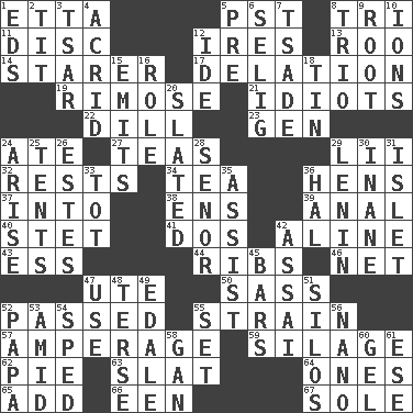 ACROSS 1. Singer James 5. Pacific Standard Time (abbr.) 8. Three (prefix) 11. Plate 12. Angers 13. Friend of Pooh 14. A viewer who gazes fixedly 17. Conveyance 19. Full of chinks, cracks, or crevices 21. Foolish or stupid persons 22. Deli pickle 23. Commissioned military rank (abbr.) 24. Had dinner 27. Beverages made from leaves 29. Cards in a Roman deck? 32. Musical pauses 34. Afternoon social gathering 36. Coop moms 37. To the inside or interior of 38. Followers of ems 39. Of or related to the anus 40. Proofreading order 41. Two (Sp.) 42. Place in a line 43. Double-curved letter 44. Teases 46. Remaining after all deductions 47. Shoshoni 50. Backtalk 52. Went by 55. Put through a sieve 57. Electrical Measurement 59. Fodder prepared in a silo 62. Sliced dessert 63. Narrow board 64. Washington bills 65. Find the sum of 66. Car or cant ending 67. Not divided or shared with others DOWN 1. Begley and Asner 2. Teat (slang) 3. Russian ruler of old 4. Sour-tasting 5. Before (prefix) 6. Former Milwaukee Brewers owner Bud 7. Sadhe (variant) 8. Musical group of three 9. Carrot, for example 10. Charged particles 12. Binary compound 15. Sends forth 16. Hero or heavy, e.g. 18. Metal container 20. Scheduled 24. Get up 25. Portable shelters 26. _____ Park, CO 28. Sir (Sp.) 29. Soviet premier 1918-24 30. Lacking in sense or substance 31. Small island 33. Small child 35. Help 36. Actor Linden 42. Slender Brazilian palm 45. Soap units 47. Purpose 48. Laconic 49. Peak District village in England 51. Grain storage towers 52. Dad 53. Among 54. Moved rapidly 55. Put into a specified state 56. Billionth: prefix 58. Separate the seeds from cotton 60. Set 61. Compass dir.