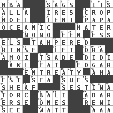 ACROSS 1. Basketball assoc. 4. Settles 8. ___ a Wonderful Life 11. Silent film actress Nazimova 13. Angers 14. Riding implement 15. Christmas carol 16. Portable shelter 17. Dad 18. Pertaining to the sea 21. Mother 22. Words to Nanette 23. Opposite of masc. 25. Curvy letter 26. Raised railways 29. ________ with (broke a safety seal) 32. Wash lightly 34. Luau accessory 35. Mouth or opening 38. Mine, in Marseilles 39. Sadhe (variant) 41. "You Light Up My Life" star Conn 43. Leather borer 44. Consume 45. _ Allan Poe 46. Plea 50. Wet nurse (var.) 51. Eastern Standard Time (abbr.) 54. Ocean 55. Institutes legal proceedings 57. Archer's quiver 59. French poetic form 63. Torque (variant) 64. Indonesian resort city 67. The sixth month of the Jewish calendar 68. Celtic language 69. Washington bills 70. Painter Guido (1575-1642) 71. Perceive with the eye 72. Electrical Unit 73. Auto club (abbr.) DOWN 1. Billionth: prefix 2. Group of countries in special alliance 3. Toward shelter 4. "Cheers" or "Ellen" 5. "We ___ not amused" (Victoria) 6. Commissioned mil. rank 7. Fast jet (abbr.) 8. Feeling or showing extreme anger 9. Drinks excessively 10. Practice fights 12. Actor Alda or Thicke 14. Accounting whiz (abbr.) 19. Brief written record 20. _ tizzy (2 wds.) 21. Madame (abbr.) 23. Nourish 24. One of the Great Lakes 26. Period 27. Pale green bean 28. Frozen precipitation 30. Food holder 31. Texas town _ City 33. Drop; flow; fall 36. Capital of Latvia 37. First man 39. Wig 40. "Two Mules for Sister ____" 42. Retirement account (abbr.) 45. Sight organs 47. Science/research agcy. 48. Aid 49. Third day of the wk. 51. _____ Park, CO 52. Dinah or Pauly 53. Laconic 56. Play the lead 58. Adept person 60. The main thing one is thinking about 61. Nanny 62. Roberta Peters solo 64. Ribbon knot 65. Santa ___, CA 66. Allow