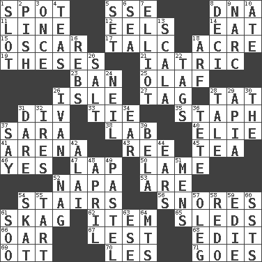 ACROSS 1. Specific locale 5. Compass dir. 8. Heredity factor (abbr.) 11. Actor's bit 12. Snakelike fish 14. Consume 15. Motion picture award 17. Baby powder 18. 43,560 square feet 19. College papers 21. Of or pertaining to medicine 23. Forbid 25. Norwegian king 26. Small island 27. Label 28. Make lace 31. HTML Container Element 33. Standoff 35. Staphylococcus 37. "Two Mules for Sister ____" 38. Experiment locale 40. Writer Wiesel 41. Sports stadium 43. To sift 45. Beverage made from leaves 46. Consenting reply 47. Pet locale 50. Unable to walk 52. California wine valley 53. "We ___ not amused" (Victoria) 54. Flight of steps 56. Sounds asleep 61. Heroin 62. A whole individual unit 65. Bobsleighs 66. Boat paddle 67. For fear that 68. Prepare for publication 69. Baseball player Mel 70. French article 71. Travels DOWN 1. Slit 2. Expression of disdain 3. At one time in the past 4. Afternoon social gatherings 5. Put into a specified state 6. Ocean 7. American author Paul (1891-1958) 8. Tenth: prefix 9. Drug cop 10. Had dinner 13. Any of the three canals of the cochlea 16. Confederate soldiers (slang) 18. Sandy's bark 20. Table seasoning 22. Labels 24. Famous astronaut Armstrong 26. _ the terrible 28. Story 29. Capital of Western Samoa 30. Definite Article 31. Have the gumption 32. Angers 34. Ewer handle 36. Wig 37. Declare 39. Actor Lugosi 42. Mountain range southwest of Kyrgyzstan 44. Hearing organs 48. Showery time 49. Soft color 51. Not women's 52. Tired old horse 54. Three-handed card game 55. Small pie 57. Cassini of fashion 58. Make new 59. Singer Brickell 60. Fast planes 61. "Barney Miller" actor Jack 63. Compass dir. 64. Mountains (abbr.)
