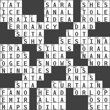 ACROSS 1. Make lace 4. "Two Mules for Sister ____" 8. "______ My Girl" (Turtles hit) 12. Frozen water 13. Of or related to the anus 14. Lacquered or enameled metalware 15. Hang back 18. It may be bright or harebrained 19. Hero or heavy, e.g. 20. Tendancy to err 22. June honoree 23. Stalk of a moss capsule 24. Car dealer's back yard 25. Like a shrinking violet 26. French poetic form 30. Period 33. Beverly of Met fame 36. Taken by mouth 37. Auction offers 39. Teachers' org. 40. Nanny 41. Double curve, resembling the letter S 42. Overwhelms 44. And not 45. Simpletons 47. Fluid product of inflammation 50. _ moment's notice (2 wds.) 51. Pismires 53. R.R. building 54. Window treatment 57. Papal veil 59. Froth on beer 61. Lowest deck of a ship 63. Independent ruler or chieftain 64. Silent film actress Nazimova 65. Bear (Spanish) 66. Atlas contents 67. Deli pickle 68. Arrange properly for use DOWN 1. Teat (slang) 2. Land measure 3. Lacerates 4. Ketch in the Levant 5. "60 Minutes" Commentator Rooney 6. Actress Charlotte 7. Chicken ___ king 8. Ski resort town in Vermont 9. Parka part 10. Pipe bend 11. Perceive with the eye 16. Angers 17. Thin strip of wood or metal 21. Negative votes 22. Two (Sp.) 24. French article 26. Cole _ (cabbage dish) 27. SW Asia republic 28. Billionth: prefix 29. Having or resembling wings 30. Inky black, to poets 31. Swiss mountan, "Queen of the Mountains" 32. An important port of Yemen 34. Restaurants 35. Lion 38. Legislators 42. Ocean 43. Coast Guard woman 46. Call ___ day 48. To (old English) 49. Play the lead 52. Grain storage towers 53. Clip 54. Give a ring to 55. Allodial 56. Sense of smell 57. Opposite of masc. 58. Wet nurse (var.) 59. Possessed 60. Connecticut Ivy Leaguer 62. Cooking vessel