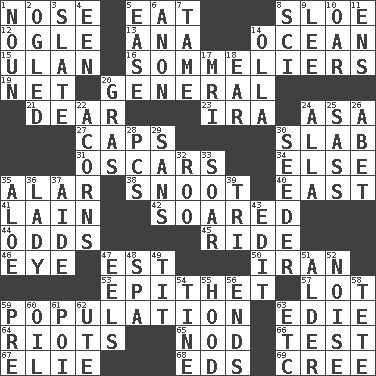 ACROSS 1. Olfactory organ 5. Ingest 8. A type of plum 12. Stare 13. Santa ___, CA 14. Sea 15. ____ Bator, Mongolia 16. Wine waiters 19. Remaining after all deductions 20. Commissioned military rank 21. Letter starter 23. Lyricist Gershwin 24. White ___ sheet 27. Balmoral and tarboosh 30. Broad, flat, thick piece 31. Motion picture awards 34. Otherwise 35. Having or resembling wings 38. Snob 40. Compass direction 41. (Had) reclined 42. Flew 44. Likelihood 45. Travel on an animal 46. Sight organ 47. Eastern Standard Time (abbr.) 50. SW Asia republic 53. Curse 57. Car dealer's back yard 59. Census information 63. Singer Brickell 64. Debaucheries 65. Allow head to fall sleepily 66. Trial 67. Writer Wiesel 68. Begley and Asner 69. Algonquian DOWN 1. Part of speech 2. Stared at amorously 3. Chalkboard 4. Car or cant ending 5. Relaxation 6. Soon (poet.) 7. Not wild 8. _-fi 9. Area sheltered from the wind 10. Boat paddle 11. Followers of ems 14. Rounded earthenware pot or jar 17. Medical imaging device (abbr.) 18. Ewer handle 20. Pate de foie ____ 22. Oak nuts 24. Silent film actress Nazimova 25. Backtalk 26. Collude with 28. Personal Computers (abbr.) 29. Without 30. Sowing specialist 32. Friend of Pooh 33. Fly high 35. _ vera 36. Kenny Rogers chart-topper in '80 37. Assistant 39. Three (prefix) 43. Prepare for publication 47. Snakelike fish 48. Health resort 49. Teat (slang) 51. Tree or shrub in the Birch family 52. Annoying sound 54. Prong on a fork 55. Parka part 56. Conclusions 58. Wig 59. Before (prefix) 60. Petroleum 61. Luau course 62. Shoshoni 63. And so on (abbr.)