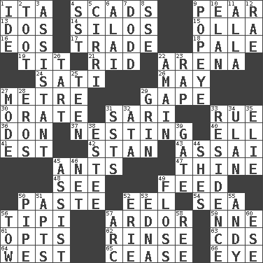ACROSS 1. Call ___ day 4. Tons 9. Lightbulb-shaped fruit 13. Two (Sp.) 14. Grain storage towers 15. Spanish pot 16. Greek goddess of the dawn 17. Barter 18. Light colored 19. Teat (slang) 21. To free from 22. Sports stadium 24. Suttee (variant) 26. Fifth month 27. Distance measurement (Brit.) 29. Yawn 30. Speak pompously 31. Indian skirt 33. Regret 36. Spanish title 37. Nestling 40. Pipe bend 41. Eastern Standard Time (abbr.) 42. Comedian Laurel of Laurel & Hardy 43. Slender Brazilian palm 45. Pismires 47. One or ones belonging to thee 48. Perceive with the eye 49. Nourish 50. Thick mixture 52. Snakelike fish 54. Ocean 56. Native american tent (variation) 57. Zeal 59. Compass dir. 61. Elects 62. Wash lightly 63. Music discs 64. 270 degrees 65. Stop 66. Sight organ DOWN 1. Binary compound 2. A blast of a horn 3. Helper 4. Fast jet (abbr.) 5. High-altitude cloud 6. Jai ____ 7. Texas town _ City 8. Compass dir. 9. Wimpy's pal 10. Enthusiasm 11. Silent film actress Nazimova 12. Actress Charlotte 20. Small pie 22. At full speed 23. Reproach for some lapse or misdeed 25. Adolescent 27. Method 28. Greek god of love 29. Broad smile 31. Fast planes 32. "One Day ___ Time" 33. Home 34. ____ Bator 35. Writer Wiesel 38. First name in cosmetics 39. Yard entry 44. "______ My Girl" (Turtles hit) 45. Aid 46. Fish or hair follower 49. Soft thread for cleaning between teeth 50. Corncob 51. Tenement units (abbr.) 52. One of the Great Lakes 53. Pulitzer Prize-winning author Ferber 55. "60 Minutes" Commentator Rooney 56. Pull behind 57. Curve 58. To sift 60. Compass dir.