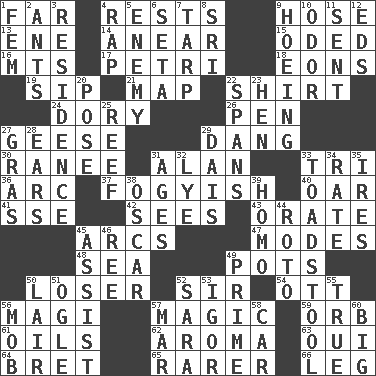 ACROSS 1. At a great distance 4. Musical pauses 9. Stockings 13. Compass dir. 14. Approach 15. Wrote a lyric poem 16. Mountains (abbr.) 17. _ dish (used to culture cells) 18. Immeasurably long periods of time 19. Small drink 21. Atlas unit 22. Chest covering 24. Rowboat 26. Fenced enclosure 27. Honkers 29. Mild oath, euphamism for damn 30. The wife of a rajah (variant) 31. ____ Jay Lerner 33. Three (prefix) 36. Curve 37. Out of fashion; old fashioned 40. Rowing implement 41. Compass dir. 42. Perceives with the eye 43. Declaim 45. Arches 47. Methods 48. Ocean 49. Plant holders 50. Failure 52. Title for a knight 54. Baseball player Mel 56. Wise men 57. Mysterious quality of enchantment 59. Globe 61. Petroleums 62. Scent 63. Fr. "Yes" 64. Cy Young winner Saberhagen 65. More valued for its uncommonness 66. Part of a journey DOWN 1. Opposite of masc. 2. Pismires 3. Home 4. Strike 5. Foe 6. Bristle 7. Canvas cover 8. Indian title of respect (Mr.) 9. Weeding 10. Aroma 11. Posted 12. Begley and Asner 20. Introduce or present, as a question 22. Connects, as a bridge 23. Layer 25. Coral ridge 27. Pate de foie ____ 28. Hearing organs 29. Raised platform 31. Grows older 32. Potassium hydroxide 33. Inedible or poisonous agaric 34. Pace 35. Angers 38. Motion picture award 39. Same (prefix) 44. Printing process, for short 45. Help 46. Portuguese money of account (variant) 49. First class 50. Den 51. Stare at amorously 52. "Two Mules for Sister ____" 53. Composer Stravinsky 55. Loyal 56. Crowd into 57. Third mo. 58. Auto 60. Large