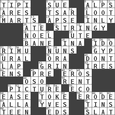 ACROSS 1. Native american tent (variation) 5. Institute legal proceedings 8. High mountains 12. Ancient Greek god of war 13. Russian ruler of old 15. Spoils 16. Shops 18. Domed church section 19. In an inward manner 20. Had dinner 22. Slender, wiry 24. Christmas carol 26. Shoshoni 27. Object of repulsion 28. _ tizzy (2 wds.) 29. Wedding promise 32. Tall New Zealand timber tree 35. Religious women 37. Hustle 38. Mountain range 39. Mouth or opening 40. Do not 41. Infant locale 42. Amused look 43. Angers 44. Followers of ems 45. Before (prefix) 46. Greek god of love 49. Bear (Spanish) 50. Monthly bill 51. Photo 55. Environmental prefix 56. Relaxation 57. Puff or smoke 59. Eat (away) 63. Silent film actress Nazimova 64. Jacques Cousteau's middle name 65. Canisters 66. Adolescent 67. Begley and Asner 68. Narrow board DOWN 1. Scottish cap 2. Retirement account (abbr.) 3. For each 4. Byzantium, centuries later 5. R.R. building 6. United States Postal Service (abbr.) 7. Compass direction 8. Place in a line 9. Having great length 10. Much (prefix) 11. Filthy place 14. Summer TV shows 17. Portico 21. Car or cant ending 23. Call ___ day 25. Poe poem 28. More lacking in sense or substance 29. Composer Stravinsky 30. Unit of force 31. Chooses 32. General guideline 33. SW Asia republic 34. Atlas contents 36. RI univ. 40. What propaganda does 42. Cross 45. Pacific Standard Time (abbr.) 47. To separate or throw off 48. At one time in the past 49. Sea 51. Diluted with white 52. Capri or Wight 53. Be footloose 54. Made supply last 56. Ingest 58. Curvy letter 60. Petroleum 61. Heredity factor (abbr.) 62. Eastern Standard Time (abbr.)