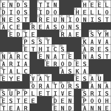 ACROSS 1. Conclusions 5. Shallow baking pan 8. Person who is morally reprehensible 12. "Vaya con ____" 13. Wedding promise 14. Phone greeting 15. A home for chicks 16. One who advocates reunion 19. Adept person 20. Thinks logically 21. Singer Brickell 23. Actress Charlotte 24. Symbol (abbr.) 27. Inconspicuous attention getter 30. Polynesian shrub of the pepper family 31. Moral principles 34. Ancient Greek god of war 35. Drug cop 38. Related on the mother's side 40. Political cartoonist Thomas 41. Roberta Peters solo 42. Eats (away) 44. Baby powder 45. "____ silly question..." 46. Sight organ 47. Large container 50. He sold his birthright 53. Speakers 57. Santa ___, CA 59. Supplying deficiencies 63. Indian titles of respect 64. First name in cosmetics 65. Lair 66. "Silly old bear" 67. Separate forcefully 68. Conclusion 69. Singer Murray DOWN 1. Pulitzer Prize-winning author Ferber 2. Sibling's daughter 3. Administered medicine 4. Fast jet (abbr.) 5. Hoop that covers a wheel 6. The main thing one is thinking about 7. Horse sense 8. Layer 9. Connecticut Ivy Leaguer 10. Raised railways 11. Car dealer's back yard 14. Stockings 17. Not either 18. _ tizzy (2 wds.) 20. Respite 22. Medicinal drug used to evoke vomiting 24. "Two Mules for Sister ____" 25. Jacques Cousteau's middle name 26. Vertical spar for supporting sails 28. A female animal or person 29. Prong on a fork 30. Sunflower state 32. 4-wheeled motor vehicle 33. Portico 35. Nathan's nickname 36. Like ___ of sunshine 37. Cause heat under the collar 39. Begley and Asner 43. Supplements with great effort 47. Grand slam 48. "We ___ not amused" (Victoria) 49. Make lace 51. Composer Copland 52. The state of being joined or united 54. Periodic rise and fall of the sea level 55. Baking chamber 56. Tear apart 58. American tennis player Robert 59. Put into a specified state 60. Purpose 61. Parent Teacher Association (abbr.) 62. For each 63. Health resort