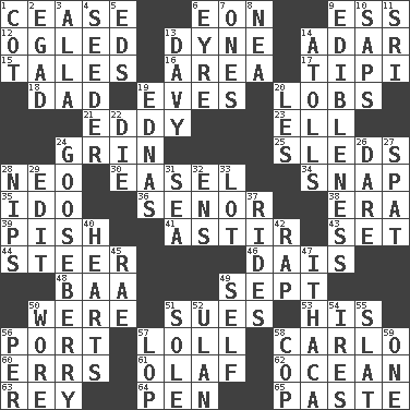 ACROSS 1. Desist 6. A really long time 9. Double-curved letter 12. Stared 13. Centimeter-gram-second unit of force 14. The sixth month of the Jewish calendar 15. Falsehoods 16. Type of rug 17. Native american tent (variation) 18. June honoree 19. Nights before holidays 20. Tennis shots 21. Whirlpool 23. Pipe bend 24. Broad smile 25. Bobsleighs 28. Modern: prefix 30. Artist's stand 34. Fastener 35. Wedding promise 36. Sir (Sp.) 38. Period 39. Expression of disdain 41. Having gotten out of bed 43. Put into a specified state 44. Navigate 46. Raised platform 48. Sound made by sheep 49. Back-to-school mo. 50. We are 51. Institutes legal proceedings 53. Part of HMS, perhaps 56. Left side of a ship or aircraft 57. Hang loosely or laxly 58. Monte _, Las Vegas Hotel/Casino 60. Blunders 61. Norwegian king 62. Sea 63. Marina Del _, California 64. Animal enclosure 65. Thick mixture DOWN 1. Small bed 2. Mild oath 3. Silent film actress Nazimova 4. Sowing specialist 5. Begley and Asner 6. Jane of fiction 7. Singles 8. Teachers' org. 9. The property of being fit to eat 10. Plant excrements 11. _ Lanka 13. _ Jones' Locker 14. Ringlike coral islands and reefs 19. Ferber et al. 20. French article 22. Pass on 24. Sour, prickly fruit 26. Have the gumption 27. Petty quarrel 28. Cuts off 29. Prepare for publication 31. Ocean 32. Followers of ems 33. Car dealer's back yard 37. Amusement-park features 40. Centers of feelings and intuitions 42. Reproach for some lapse or misdeed 45. Actress Charlotte 47. New York city 49. Automatic 50. Had on 51. Not divided or shared with others 52. ____ Bator 54. Angers 55. Narrow board 56. For each 57. Chop off 58. Police officer (slang) 59. Single