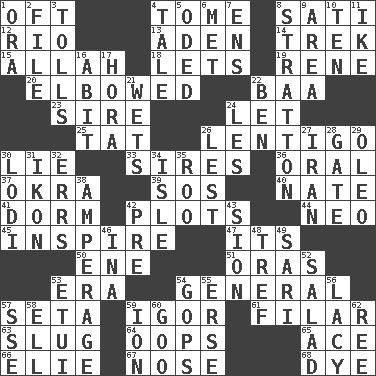 ACROSS 1. Often (poetically) 4. Heavy book 8. Suttee (variant) 12. River (Sp.) 13. Arabian gulf 14. Long journey 15. Assad's deity 18. Allows 19. French philosopher Descartes 20. Shoved, as through a crowd 22. Sound made by sheep 23. The founder of a family 24. Allow 25. Make lace 26. Small, flat, pigmented spot on the skin 30. Whopper 33. Begets 36. Spoken 37. Gumbo ingredient 39. Mayday 40. Nathan's nickname 41. Dormintory (informal) 42. Schemes 44. Modern: prefix 45. Heighten or intensify 47. It is 50. Compass dir. 51. Mouths or openings 53. Period 54. Commissioned military rank 57. Bristle 59. Russian composer Stravinsky 61. Having threads 63. Strike heavily 64. I made a mistake 65. Adept person 66. Writer Wiesel 67. Olfactory organ 68. Color DOWN 1. Mouth or opening 2. Do some clerical work 3. For Whom the Bell _____ 4. Falsehood 5. Wrote a lyric poem 6. Was introduced to 7. Followers of ems 8. Ski resort town in Vermont 9. Type of rug 10. Nine, plus one 11. Eisenhower's nickname 16. "This won't hurt ____!" 17. Israeli folk dance 21. Soaks 22. Benjamin's nick name 24. French article 26. For fear that 27. SW Asia republic 28. Yard entry 29. Margarine 30. Farming town in central California 31. Image 32. Blunders 34. Capri or Wight 35. Friend of Pooh 38. Electrical Measurement 42. Before (prefix) 43. The Jewish people; Israel 46. _ tizzy (2 wds.) 48. Unclean, religiously 49. Indian skirt 52. Vegetable dish 53. Needle holder 54. Republicans 55. Celtic language 56. Made of lace 57. Compass dir. 58. Pipe bend 59. Electrically charged atom 60. Thick or sticky substance 62. Portuguese money of account (variant)