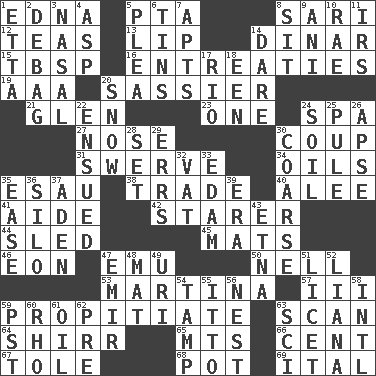 ACROSS 1. Pulitzer Prize-winning author Ferber 5. Parent Teacher Assoc. 8. Indian skirt 12. Afternoon social gatherings 13. Mouth edge 14. Middle Eastern gold or silver currency 15. Cook's measure (abbr.) 16. Pleas 19. Auto club (abbr.) 20. More impudent 21. Small, secluded valley 23. Single 24. Health resort 27. Olfactory organ 30. Overturn; upset 31. Turn aside suddenly 34. Petroleums 35. He sold his birthright 38. Exchange 40. Toward shelter 41. Helper 42. A viewer who gazes fixedly 44. Downhill vehicle 45. Floor coverings 46. A really long time 47. Australian flightless bird 50. 1994 drama film starring Jodie Foster 53. Chrissie's court nemesis 57. One more than two 59. Appease 63. Examine minutely or intensely 64. Bake eggs in their shells 65. Mountains (abbr.) 66. Penny 67. Lacquered or enameled metalware 68. Plant holder 69. Slanted text style (abbr.) DOWN 1. Singer James 2. Debunk (Brit. slang) 3. Relating to the nose 4. Cleo's killer 5. Entreaty 6. Canisters 7. Flats, for short 8. Be seated 9. Cuckoo 10. Actress Charlotte 11. Big collection agency 14. Have the gumption 17. River (Sp.) 18. Car or cant ending 20. Frozen precipitation 22. Took place subsequently 24. Land 25. Whine 26. Domed church section 28. Put into a specified state 29. Blunders 30. Rough 32. Large container 33. Dutch treat 35. Comfort 36. Grain storage tower 37. An important port of Yemen 39. Period 43. Inactive volcano in Sicily 47. Independent ruler or chieftain 48. Floor protector 49. RI univ. 51. It is permitted: Lat. 52. Climbing, woody, usually tropical vines 54. Pack (down) 55. "Tell ____ the Marines!" 56. Egg locale 58. International (abbr.) 59. Pacific Standard Time (abbr.) 60. 17th letter of the Greek alphabet 61. Petroleum 62. Before (prefix) 63. _-fi