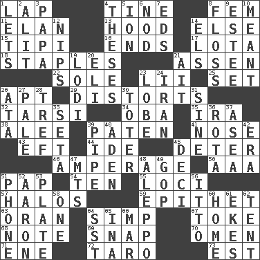 ACROSS 1. Infant locale 4. Prong on a fork 8. Opposite of masc. 11. Style 13. Parka part 14. Otherwise 15. Native american tent (variation) 16. Conclusions 17. Globular water bottle used in Asia 18. Paper fasteners 21. NE Netherlands city 22. Flatfish 23. Cards in a Roman deck? 25. Arrange properly for use 26. Fitting 29. What propaganda does 32. Tarsus (plural) 34. Chief or king in Benin or Nigeria 35. Retirement account (abbr.) 38. Toward shelter 39. Eucharist need 41. Sense of smell 43. Lizard (obsolete) 44. Binary compound 45. Prevent from occurring 46. Electrical Measurement 50. Auto club (abbr.) 51. Infant food 54. Nine, plus one 55. Locales 57. Radiant circles of light 59. Curse 63. NW Algerian seaport 64. Simple or foolish person 67. Casino tip 68. Brief written record 69. Fastener 70. Sign of something about to happen 71. Compass dir. 72. Edible starchy tuberous root 73. Eastern Standard Time (abbr.) DOWN 1. Allows 2. Came down and settled, as after flight 3. Dad 4. College papers 5. Electrically charged atom 6. Allow head to fall sleepily 7. Begley and Asner 8. Soft thread for cleaning between teeth 9. First name in cosmetics 10. Intended 12. Pinches, bites 14. Raised railways 19. Farming town in central California 20. Biblical high priest 21. Small island 23. Ear part 24. SW Asia republic 26. "One Day ___ Time" 27. Light colored 28. Unclean, religiously 30. Carrier 31. Trig term 33. Bristle 36. Roll call or roster of names 37. Toward the sea 39. Corncob 40. Arabian gulf 42. Epoch 45. Tenth: prefix 47. Mountains (abbr.) 48. City in Syria 49. Grand Old Party 51. Give a jingle 52. Composer Copland 53. Food holder 56. "Tell ____ the Marines!" 58. Single 60. Dwelling 61. Makes supply last 62. Portable shelter 64. Fast jet (abbr.) 65. _ tizzy (2 wds.) 66. Third mo.