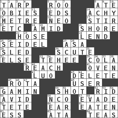 ACROSS 1. Canvas cover 5. Friend of Pooh 8. Had dinner 11. Off-Broadway awards 13. Begley and Asner 14. Painful 15. Distance measurement (Brit.) 16. Modern: prefix 17. Tumult 18. And so on (abbr.) 19. Among 21. Dinah or Pauly 22. Stockings 24. Grant temporary use of 25. Beer mug 27. White ___ sheet 29. Downhill vehicle 30. Snake scale 32. Otherwise 33. Giggle 35. Root beer relative 39. Arrive at 41. Baking chamber 42. Nilotic language 43. Keyboard key 45. Round or rotation of duties 48. One who uses or employs something 49. Street urchin 50. Guess 52. To free from 55. Enthusiastic 56. Non-commissioned officer (abbr.) 57. Dodge 59. False hair 60. Hearing organ 61. Ingested 62. Curvy letter 63. "One Day ___ Time" 64. Afternoon social gatherings DOWN 1. Heavy book 2. Collude with 3. Actors Guy, Robert Welles, and Clint 4. For each 5. Painter Guido (1575-1642) 6. Wrote a lyric poem 7. Bear (Spanish) 8. Gambison 9. One of three equal parts 10. Jane of fiction 12. Gospel singer Marvin 14. American tennis player Robert 20. Cartoonist voice _ Blanc 21. Narrow board 23. More peculiar 25. Compass dir. 26. Pipe bend 27. Adept person 28. Institute legal proceedings 30. Quiet! 31. Learning spot: Fr. 33. The 19th letter of the Greek alphabet 34. Environmental prefix 36. Make much ado about nothing 37. Allow 38. One (Scot) 40. Enthusiasm 43. Superhero pair 44. First name in cosmetics 45. All-night dance parties 46. Leaves out 47. Event that recurs at intervals 49. Yard entry 50. Scram! 51. Israeli folk dance 53. The main thing one is thinking about 54. Cub Scout units 56. Teachers' org. 58. Large container
