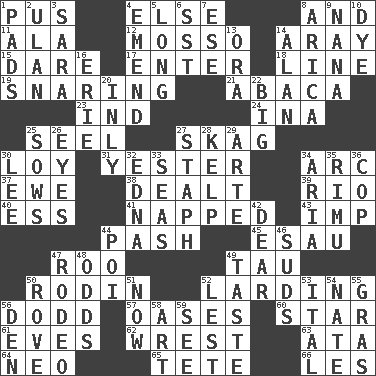 ACROSS 1. Fluid product of inflammation 4. Otherwise 8. Also 11. According to 12. With motion or animation 14. Like ___ of sunshine 15. Have the gumption 17. Keyboard key 18. Actor's bit 19. Catching in a trap 21. Phillipine bananalike plant 23. Indiana (abbr.) 24. _ tizzy (2 wds.) 25. Stitch closed the eyes of (a falcon) 27. Heroin 30. Myrna of the movies 31. Of or pertaining to yesterday 34. Curve 37. She-sheep 38. Started a card game 39. _ de Janeiro 40. Double-curved letter 41. Slept 43. Mischievous child 44. Romantic infatuation 45. Son of Isaac 47. Friend of Pooh 49. The 19th letter of the Greek alphabet 50. "The Thinker" sculptor 52. Preparing or cooking with lard 56. Texas town _ City 57. Fertile tracts in a desert 60. Play the lead 61. Nights before holidays 62. Take or capture by force 63. _ moment's notice (2 wds.) 64. Modern: prefix 65. Wig 66. French article DOWN 1. Groovy apts. 2. ____ Bator 3. "Two Mules for Sister ____" 4. Make improvements or corrections to 5. Having great length 6. Fast jet (abbr.) 7. Compass dir. 8. N. Chile seaport 9. Grandmother 10. Color 13. Mouth or opening 14. Actor Alda or Thicke 16. One of the Great Lakes 20. In an inward manner 22. Of large size 25. Sty mamas 26. Sight organs 27. Staphylococcus 28. Seaweed 29. Johnson of "Laugh-In" 30. Area sheltered from the wind 32. Pulitzer Prize-winning author Ferber 33. Oceans 34. Operatic vocal solo 35. Tall New Zealand timber tree 36. Police officer (slang) 42. Letter starter 44. Luau course 46. Soap bubbles 47. Cowboy competition 48. Likelihood 49. Clothes sense 50. Be footloose 51. At this time 52. For fear that 53. Slanted text style (abbr.) 54. Nathan's nickname 55. Pate de foie ____ 56. Lair 58. Nonscientific branch of learning 59. Perceive with the eye