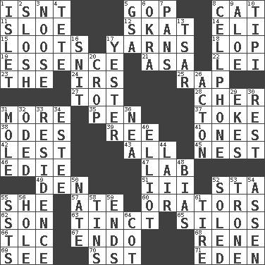 ACROSS 1. Is not 5. Grand Old Party 8. Domesticated feline 11. A type of plum 12. Three-handed card game 14. Connecticut Ivy Leaguer 15. Plunders 17. Entertaining tales 18. Chop off 19. Center 21. White ___ sheet 22. Flowery wreath 23. Definite Article 24. Big collection agency 25. Reproach for some lapse or misdeed 27. Small child 28. "Mermaids" star 31. Greater amount 35. Fenced enclosure 37. Puff or smoke 38. Lyric poems 39. To separate or throw off 41. Washington bills 42. For fear that 43. Everything 45. Egg locale 46. Singer Brickell 47. Experiment locale 49. Lair 51. One more than two 52. R.R. building 55. A female animal or person 57. Had dinner 60. Speakers 62. Male child 63. Colored lightly or faintly 65. Grain storage towers 66. Affectionate concern, for short 67. Inside; within (prefix) 68. French philosopher Descartes 69. Perceive with the eye 70. Fast jet (abbr.) 71. Paradise DOWN 1. Small island 2. Make a splashing sound 3. Trap for birds or small mammals 4. Wig 5. Girls' org. (abbr.) 6. Gumbo ingredient 7. Zero-star reviews 8. Portable communications device 9. _ vera 10. Native american tent (variation) 13. Russian ruler of old 16. In a ____ (agitated or irritated) 17. Last 20. Riding implement 26. 13-14th century defensive garment 29. Supplements with great effort 30. State of inaction 31. Undercover agent 32. Wrote a lyric poem 33. Dwelling 34. First name in cosmetics 36. Teachers' org. 40. American author Paul (1891-1958) 44. Den 48. Prejudice 50. Nathan's nickname 52. Having a sole or soles 53. Heavy duty weighing machine 54. NE Netherlands city 55. Fast planes 56. Hollow 58. Airtight sealed metal containers 59. Extremities 61. Hoop that covers a wheel 64. Small bed