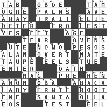 ACROSS 1. Bar bill 4. Mitch Miller's instrument 8. Scottish cap 11. Legendary monster 13. Insides of hands 15. "___ Maria" 16. Like ___ of sunshine 17. Distinguishing feature 18. Writer Wiesel 19. Prevent from occurring 21. From 22. For fear that 23. Consenting reply 24. Newt 27. Ripen 29. Rend 30. Baking chambers 34. Shoshoni 36. Words to Nanette 39. Mexican monetary units 40. ____ Jay Lerner 41. Unconcealed 43. Nathan's nickname 44. Grayish beige 46. Snakelike fish 47. Third day of the wk. 48. Keyboard key 49. Pledge 51. Tired old horse 53. Before (prefix) 54. Layer 57. At once, immediately (arch.) 60. Chief or king in Benin or Nigeria 63. Phillipine bananalike plant 65. Kenny Rogers chart-topper in '80 66. Bert's buddy 69. Carrot, for example 70. Compass dir. 71. Before Barbara or Clara 72. Rounded earthenware pot or jar 73. Greek goddess of the dawn 74. Trial 75. Snakelike fish DOWN 1. Sycophant 2. Match 3. Naughty children 4. Choose 5. Soap unit 6. Norwegian king 7. Arab leader 8. Story 9. Advice 10. Confront 12. Sight organ 14. Portico 18. Veterans Day date 20. To sift 25. Papal veil 26. Collection of objects 28. Grand Old Party 29. 3-inch nail 31. He sold his birthright 32. Make mention of 33. Compass dir. 34. Uhlan (variant) 35. Strained 37. Born 38. Lowest deck of a ship 40. Had dinner 42. Russian ruler of old 45. Epoch 50. Beverage made from leaves 52. Travels 54. White Person, in Hawaii 55. Learning spot: Fr. 56. Relating to or accompanying birth 57. Toward shelter 58. Billionth: prefix 59. Lyric poems 61. Naughty child 62. Queen of England 1702-14 64. Sis' sibling 67. It is 68. Consume