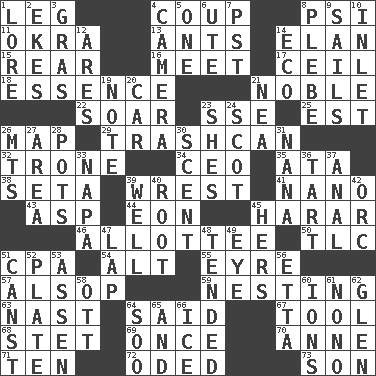 ACROSS 1. Part of a journey 4. Clever action or accomplishment 8. 23rd letter of the Greek alphabet 11. Gumbo ingredient 13. Pismires 14. Enthusiasm 15. Bring up, as a child 16. Rendezvous 17. To provide with a ceiling 18. Core 21. Having high moral qualities 22. Fly high 23. Compass dir. 25. Eastern Standard Time (abbr.) 26. Atlas unit 29. File 13 32. Marketplace scale 34. Corporate head (abbr.) 35. "One Day ___ Time" 38. Bristle 39. Obtain by seizing forcibly or violently 41. Billionth: prefix 43. Viper 44. A really long time 45. Ethiopian city, capital of Harari 46. One to whom something is allotted 50. Affectionate concern, for short 51. Accounting whiz (abbr.) 54. The first octave above the treble staff 55. Jane of fiction 57. Columnist Joseph or Stewart 59. Inhabiting a nest 63. Political cartoonist Thomas 64. Alleged 67. Implement 68. Proofreading order 69. At one time in the past 70. Singer Murray 71. "___ Little Indians" 72. Wrote a lyric poem 73. Manchild DOWN 1. Old wives' tales, e.g. 2. Makes supply last 3. Pate de foie ____ 4. Device for capturing images 5. Single 6. Shoshoni 7. Pacific Standard Time (abbr.) 8. Cadet 9. Travels by water 10. An arm off of a larger body of water 12. Ancient Greek god of war 14. Environmental prefix 19. Short letter 20. Auto 21. Teachers' org. 23. "______ My Girl" (Turtles hit) 24. Native of Scotland 26. Mountains (abbr.) 27. Length times width 28. Cooking vessels 30. Odor 31. Grandmother 33. California wine valley 36. Small pie 37. Of or related to the anus 39. Not ill 40. Carrot, for example 42. The grampus (Milton) 45. Possessive pronoun 47. Infant locale 48. Watched over 49. Sight organ 51. 2nd pers. sing. pres. of can (arch.) 52. Food holder 53. NE Netherlands city 56. Singer James 58. Baseball player Mel 60. Charged atoms 61. Words to Nanette 62. Small, secluded valley 64. "Barney Miller" actor Jack 65. Plus 66. Frozen water