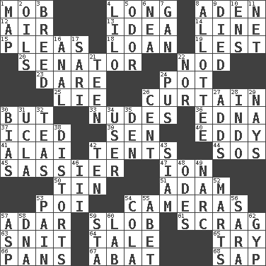 ACROSS 1. Crowd into 4. Yearn 8. An important port of Yemen 12. Atmosphere 13. The main thing one is thinking about 14. Actor's bit 15. Entreaties 18. Grant temporary use of 19. For fear that 20. Elected representative 22. Dreamland 23. Have the gumption 24. Plant holder 25. Whopper 26. Window treatment 30. Yet 33. Unadorned figures 36. Pulitzer Prize-winning author Ferber 37. On the rocks 39. Elected rep. 40. Whirlpool 41. Mountain range southwest of Kyrgyzstan 42. Portable shelters 44. Mayday 45. More disrespectful 47. Electrically charged atom 50. Metal container 51. First man 53. Luau course 54. Devices for capturing images 57. The sixth month of the Jewish calendar 59. Messy guy 61. Strangle with an iron collar 63. In a ____ (agitated or irritated) 64. Falsehood 65. Attempt 66. Baking dishes 67. Blind as ____ 68. Plant excrement DOWN 1. Atlas unit 2. Lubricates 3. A special lineage 4. _ and Stitch 5. Aroma 6. Teachers' org. 7. Separate the seeds from cotton 8. One to whom something is allotted 9. Passed on 10. Followers of ems 11. Remaining after all deductions 16. Of or related to the anus 17. Indian skirt 21. Adolescent 22. Not either 24. Fluid product of inflammation 26. Penny 27. Sums up 28. Southeast Asian peninsula 29. Negative votes 30. Prejudice 31. Southern CA. univ. 32. Afternoon social gatherings 34. One who makes use of a thing 35. Lair 38. What propaganda does 42. "___ Little Indians" 43. Thailand, formerly 46. One more than two 48. Lyric poems 49. Drug cop 52. Shops 53. Ache 54. Root beer relative 55. Collude with 56. "Two Mules for Sister ____" 57. Viper 58. Heredity factor (abbr.) 59. R.R. building 60. Experiment locale 62. Con