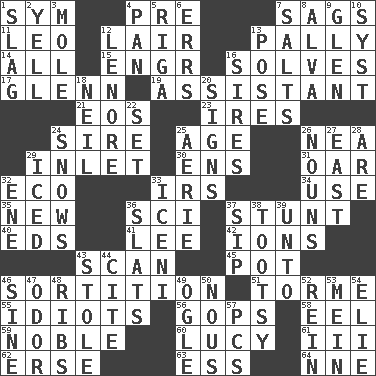 ACROSS 1. Symbol (abbr.) 4. Before (prefix) 7. Sinks 11. Lion 12. Den 13. Friendly 14. 100% 15. Engineer (abbr.) 16. Finds the solution 17. American astronaut and politician John 19. Helper 21. Greek goddess of the dawn 23. Angers 24. Father 25. Grow older 26. Teachers' org. 29. An arm off of a larger body of water 30. Followers of ems 31. Boat paddle 32. Environmental prefix 33. Big collection agency 34. Purpose 35. ___ Haven, CT 36. _-fi 37. Check the growth or development of 40. Begley and Asner 41. Area sheltered from the wind 42. Charged particles 43. Glance over 45. Plant holder 46. Decision 51. Singer Mel 55. Foolish or stupid persons 56. Republicans 58. Snakelike fish 59. Impressive in appearance 60. "I Love _" 61. One more than two 62. Celtic language 63. Double-curved letter 64. Compass dir. DOWN 1. Volcanic refuse 2. Shout 3. Undercover agent 4. Baking dish 5. Capital of Latvia 6. Blunders 7. Table seasonings 8. Inventor's middle name 9. Small, secluded valley 10. System (abbr.) 12. Poe poem 13. Introduce or present, as a question 16. Male parents of animals 18. Famous astronaut Armstrong 20. Signals 22. Put into a specified state 24. Frozen precipitation (plural) 25. Nest on high 26. Parts of speech 27. 90 degrees 28. "We ___ not amused" (Victoria) 29. On the rocks 32. Compass dir. 33. Ancient Celtic tribe of eastern Britain 36. Narrow boards 37. Small drink 38. Tootsie (variant) 39. To (old English) 43. Took without asking 44. Quote 46. Trig term 47. Aroma 48. Teases 49. Stare at amorously 50. Good sense 52. It's straight from the horse's mouth 53. Count _ (2 wds.) 54. Writer Wiesel 57. Personal Computers (abbr.)