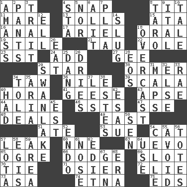 ACROSS 1. Fitting 4. Fastener 8. Teat (slang) 11. Female horse 13. For Whom the Bell _____ 15. _ moment's notice (2 wds.) 16. Of or related to the anus 17. Satellite of Uranus 18. Spoken 19. Vertical member of a panel or frame 21. The 19th letter of the Greek alphabet 22. Grand slam 23. Fast jet (abbr.) 24. Say or write further 27. Unit of force equal to gravity 29. Play the lead 30. Abalone 34. The 23rd letter of the Hebrew alphabet 36. Mediterranean tributary 39. Any of the three canals of the cochlea 40. Israeli folk dance 41. Honkers 43. Domed church section 44. Place in a line 46. Fast planes 47. Compass dir. 48. Allots cards 49. Compass direction 51. Had dinner 53. Institute legal proceedings 54. Feline 57. Path through which fluid escapes 60. Compass dir. 63. New (sp.) 65. Legendary monster 66. Evade 69. Notch 70. Make a knot 71. Flexible twig of a willow tree 72. Writer Wiesel 73. White ___ sheet 74. Inactive volcano in Sicily 75. Begley and Asner DOWN 1. Collect or gather 2. Leg coverings 3. Distinguishing feature 4. R.R. building 5. And not 6. Came down and settled, as after flight 7. Entreaty 8. Pacific island yam 9. Slanted text style (abbr.) 10. Falsehood 12. Pipe bend 14. Strike heavily 18. Cloudy 20. Consume 25. Mild oath, euphamism for damn 26. Frees from moisture 28. Greek goddess of the dawn 29. Tchaikovsky ballet 31. Atlas contents 32. Otherwise 33. Actress Charlotte 34. Lacquered or enameled metalware 35. Operatic vocal solo 37. French article 38. _____ Park, CO 40. Possessed 42. Son of Isaac 45. Eastern Standard Time (abbr.) 50. Elected rep. 52. Inside; within (prefix) 54. Cell (Danish) 55. Prevent the occurrence of 56. Lugs 57. Globular water bottle used in Asia 58. The front part of a cuirass 59. Length times width 61. Olfactory organ 62. Prepare for publication 64. Purpose 67. Commissioned military rank (abbr.) 68. Period