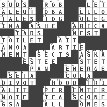 ACROSS 1. Soap bubbles 5. Director Reiner 8. Allow 11. Native American of Southwest Alaska 13. Chief or king in Benin or Nigeria 14. _ and Stitch 15. Falsehoods 16. Coat; cloak 17. Cassini of fashion 18. _ tizzy (2 wds.) 19. American tennis player Robert 21. N. Chile seaport 22. Bits 24. Egg locale 25. Rest room 27. Small island 29. Small Philippine buffalo 30. Nick name for Arthur 32. Gone 33. Religious groups 35. "____ silly question..." 39. First name in cosmetics 41. Proofreading order 42. Baking dish 43. Develop 45. Bristle 48. Root beer relative 49. A piece of turf (Scot.) 50. Parka part 52. Three (prefix) 55. Came down and settled, as after flight 56. For each 57. Keyboard key 59. Musical sound 60. Afternoon social gathering 61. Biscuitlike quick bread 62. Girls' org. (abbr.) 63. Everything 64. Washington bills DOWN 1. Suttee (variant) 2. Uhlan (variant) 3. Accusation by an informer 4. Institute legal proceedings 5. Writer of Portnoy's Complaint (1969) 6. Mitch Miller's instrument 7. Paper or plastic container 8. Ms. Damita and namesakes 9. Voters do this 10. Ancient Roman robe 12. Sadhe (variant) 14. Old wives' tales, e.g. 20. Fast jet (abbr.) 21. Against 23. Having winglike extensions 25. The 23rd letter of the Hebrew alphabet 26. Single 27. Nonscientific branch of learning 28. ___ a Wonderful Life 30. Adept person 31. Artist's stand 33. R.R. building 34. Car or cant ending 36. Ski resort town in Vermont 37. Barrel 38. Had dinner 40. Petty quarrel 43. Environmental prefix 44. Methods 45. Grain storage towers 46. Webber/Rice musical 47. Lug 49. Mild oath, euphamism for damn 50. The bottom of a shoe or boot 51. Relating to the mouth 53. French philosopher Descartes 54. Angers 56. Parent Teacher Association (abbr.) 58. Non-commissioned officer (abbr.)
