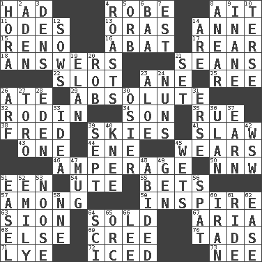 ACROSS 1. Possessed 4. Loose flowing garment 8. Small island 11. Lyric poems 13. Mouths or openings 14. Queen of England 1702-14 15. Former U.S. Attorney General Janet 16. Blind as ____ 17. Posterior 18. Statements in reply to questions 21. Actors Connery and Penn 22. Narrow, elongated depression 23. A saturated hydrocarbon 25. To sift 26. Had dinner 29. Utter; complete 32. "The Thinker" sculptor 34. Male child 35. Sorrow 38. Flintstone 39. Atmospheres 41. Cole _ (cabbage dish) 43. Single 44. Compass dir. 45. Erodes 46. Electrical Measurement 50. Compass dir. 51. Car or cant ending 54. Shoshoni 55. Wagers 57. Amid 59. Motivate 63. The Jewish people; Israel 64. Exchanged or delivered for money 67. Roberta Peters solo 68. Otherwise 69. Algonquian 70. Small boys 71. Sodium hydroxide 72. On the rocks 73. Born DOWN 1. Israeli folk dance 2. Arabian gulf 3. Hiding places for outlaws 4. Exposes to great heat 5. Globe 6. Sound made by sheep 7. Eastern Standard Time (abbr.) 8. Approach 9. Silly 10. Laconic 12. Sty mamas 14. "We ___ not amused" (Victoria) 19. Flair 20. Director Reiner 21. Put into a specified state 23. Medicinal plant 24. Religious women 26. Sandy's bark 27. "Corrida" creature 28. Paradise 30. Flexible twig of a willow tree 31. Celtic language 33. The content of cognition 36. ____ Bator 37. Merit 39. Back-to-school mo. 40. Leg joint 42. Compass dir. 45. Moistens 47. Java container 48. Stayed 49. Commissioned military rank (abbr.) 51. Artist's stand 52. Poet Dickinson 53. Trap for birds or small mammals 56. Argument over a trivial matter 58. Compass dir. 60. SW Asia republic 61. Travel on an animal 62. Relaxation 64. _-fi 65. The grampus (Milton) 66. Area sheltered from the wind