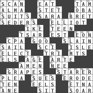 ACROSS 1. Examine hastily 5. Consume 8. Scottish cap 11. _ mater 12. Proofreading order 14. Chief or king in Benin or Nigeria 15. Sets or collections 17. "Two Mules for Sister ____" 18. Cy Young winner Saberhagen 19. Spring feasts 21. American author Paul (1891-1958) 23. Eisenhower's nickname 25. Adolescent 26. Russian ruler of old 27. Eastern Standard Time (abbr.) 28. Period of immesurable duration 31. Numbers guy (abbr.) 33. Thick or sticky substance 35. Killed 37. Travel by water 38. _-fi 40. Small island 41. Voters do this 43. Three (prefix) 45. Mountains (abbr.) 46. Raised railways 47. Grow older 50. Johnson of "Laugh-In" 52. So be it 53. Born 54. Raisin fruits 56. A viewer who gazes fixedly 61. Entreaty 62. Takes to court 65. Wear away 66. Nine, plus one 67. Snakelike fish 68. Inactive volcano in Sicily 69. A saturated hydrocarbon 70. Be seated 71. Fly high DOWN 1. Backtalk 2. A slight indication 3. Among 4. Nathan's nickname 5. Curvy letter 6. _ moment's notice (2 wds.) 7. Cylindrical with tapered ends 8. "Corrida" creature 9. Collude with 10. Floor protector 13. Lies 16. Indian titles of respect 18. Storage container 20. Heroin 22. Allows 24. Greek god of love 26. Baby powder 28. Compass direction 29. Petroleums 30. Compass dir. 31. Give a ring to 32. Sliced desserts 34. Sep. follower 36. Citrus frut 37. Perceive with the eye 39. SW Asia republic 42. Pack (down) 44. Angers 48. Honkers 49. Follows as a consequence or result 51. False hair 52. Auto club (abbr.) 54. Small, secluded valley 55. French philosopher Descartes 57. Ancient Greek god of war 58. Printing process, for short 59. Pulitzer Prize-winning author Ferber 60. Bring up, as a child 61. Parent Teacher Association (abbr.) 63. Connecticut Ivy Leaguer 64. Fast jet (abbr.)