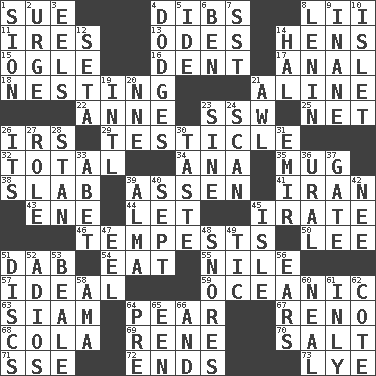 ACROSS 1. Take to court 4. Rights 8. Cards in a Roman deck? 11. Angers 13. Lyric poems 14. Coop moms 15. Stare 16. Gouge 17. Of or related to the anus 18. Snuggling 21. Place in a line 22. Singer Murray 23. Compass dir. 25. Remaining after all deductions 26. Big collection agency 29. One of the two male reproductive glands 32. Add up to 34. Santa ___, CA 35. Large cup 38. Thick slice 39. NE Netherlands city 41. SW Asia republic 43. Compass dir. 44. Allow 45. Feeling or showing extreme anger 46. Storms 50. Area sheltered from the wind 51. Pat or tap gently 54. Erode 55. Mediterranean tributary 57. Perfect 59. Pertaining to the sea 63. Thailand, formerly 64. Lightbulb-shaped fruit 67. Western Nevada city 68. Root beer relative 69. French philosopher Descartes 70. Table seasoning 71. Compass dir. 72. Conclusions 73. Sodium hydroxide DOWN 1. The Jewish people; Israel 2. Goad 3. Snakelike fish 4. Evades 5. Binary compound 6. Benjamin's nick name 7. Fast jet (abbr.) 8. Soviet premier 1918-24 9. Empty; void 10. Small island 12. Bristle 14. Actor Linden 19. International (abbr.) 20. Compass dir. 21. Leather borer 23. Trig term 24. Examine hastily 26. ___ a Wonderful Life 27. Hero or heavy, e.g. 28. Comedian Laurel of Laurel & Hardy 30. Clothes sense 31. Independent ruler or chieftain 33. Collude with 36. Mountain range 37. Yard entry 39. _ mater 40. Back-to-school mo. 42. Born 45. Small island 47. Snakelike fish 48. Sounds asleep 49. Nervous spasm 51. Plates 52. Goodbye (Sp.) 53. Calif. Air Force Base 56. Hearing organs 58. Nursemaid (var.) 60. Be tempered by heat 61. In an inward manner 62. ____ d'Azur (French Riviera) 64. Before (prefix) 65. Car or cant ending 66. Added to
