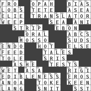 ACROSS 1. From 4. Brightly colored fish 8. Prejudice 12. Tennis shots 14. False hair 15. At sea 16. Writer Wiesel 17. Interpreter 20. Shed a tear 21. Ocean 22. Black tropical American cuckoo 23. Remove all contents or possession from 27. Inky black, to poets 29. Of the mouth 31. Lettered men learn these first 34. With motion or animation 35. Beer foam 36. Inside; within (prefix) 39. Being at a high temperature 41. Otherwise 42. Nourish 43. Stories 46. Lacquered or enameled metalware 47. Indian titles of respect 48. American tennis player Robert 51. Trials 54. Dripping 56. White ___ sheet 58. Swiss mountan, "Queen of the Mountains" 61. The property of being fit to eat 66. Greek god of love 67. Small Philippine buffalo 68. Casino tip 69. Peachy ____! 70. Long (Scottish) 71. In a ____ (agitated or irritated) 72. Fast jet (abbr.) DOWN 1. Soared 2. Hero or heavy, e.g. 3. Off-Broadway awards 4. Baseball player Mel 5. For each 6. _ moment's notice (2 wds.) 7. Coop moms 8. Sound made by sheep 9. Byzantium, centuries later 10. A really long time 11. Indian skirt 13. Back-to-school mo. 18. Perceive with the eye 19. Experiment locale 24. Friend of Pooh 25. Big collection agency 26. Romantic infatuation 28. Fertile tracts in a desert 30. Plunders 32. Music discs 33. Compass dir. 34. Methods 36. Bank Draft (abbr.) 37. Modern: prefix 38. Accusation by an informer 40. Small pie 44. Falsehood 45. Curvy letter 49. Actor Linden 50. Compass dir. 52. Long journey 53. Fathers 54. Welt 55. Pulitzer Prize-winning author Ferber 57. Pismires 59. Leaves 60. Is not 62. Paper or plastic container 63. A really long time 64. What Jean-Claude Killy likes to do 65. Put into a specified state