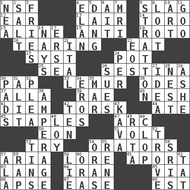 ACROSS 1. Overdraft (abbr.) 4. Dutch treat 8. Volcanic refuse 12. Hearing organ 13. Den 14. "Corrida" creature 15. Place in a line 18. Against 19. Printing process, for short 20. Separating forcefully 22. Consume 23. System (abbr.) 24. Cooking vessel 25. Ocean 26. French poetic form 30. Infant food 33. Arboreal primate 36. Lyric poems 37. Silent film actress Nazimova 39. Actress Charlotte 40. Tender 41. South Vietnam president (1954) 42. Cod relative 44. Had dinner 45. Paper fasteners 47. Curve 50. A really long time 51. Electrical Unit 53. Attempt 54. Speakers 57. Roberta Peters solo 59. Old wives' tales, e.g. 61. To the left, to Queeg 63. Austrian-born American filmmaker Fritz 64. SW Asia republic 65. By way of 66. Domed church section 67. Relaxation 68. Eastern Standard Time (abbr.) DOWN 1. Teachers' org. 2. Table seasoning 3. Strips of potato fried in deep fat 4. Style 5. Mild oath, euphamism for damn 6. Small island 7. Medical imaging device (abbr.) 8. Ski resort town in Vermont 9. Plunder 10. Tate display 11. Thick or sticky substance 16. Negative votes 17. Celtic language 21. Slanted text style (abbr.) 22. Greek goddess of the dawn 24. For each 26. Takes to court 27. The main thing one is thinking about 28. Egg locale 29. American tennis player Robert 30. Groovy apts. 31. Set down 32. Entreaty 34. Greek god of love 35. Third mo. 38. Electrical Measurement 42. Nine, plus one 43. Polynesian shrub of the pepper family 46. Myrna of the movies 48. Roll call or roster of names 49. Hoof sound 52. Collection of objects 53. Metal containers 54. Mouths or openings 55. French philosopher Descartes 56. Indian titles of respect 57. Chicken ___ king 58. Reproach for some lapse or misdeed 59. Falsehood 60. Mouth or opening 62. Make lace