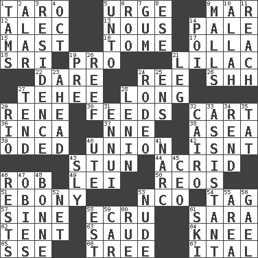 ACROSS 1. Pacific island yam 5. Goad 9. Spoil 12. Actor Baldwin 13. Good sense 14. Diluted with white 15. Vertical spar for supporting sails 16. Heavy book 17. Water jar 18. _ Lanka 19. Adept person 21. Pale purple color 22. Have the gumption 24. To sift 26. Quiet! 27. Giggle 28. Yearn 29. French philosopher Descartes 30. Eats 32. Haul 36. South American Indian 37. Compass dir. 38. Toward the sea 39. Wrote a lyric poem 40. The state of being joined or united 42. Is not 43. Astound 44. Bitter 46. Director Reiner 49. Flowery wreath 50. Vintage cars 51. Black 53. Non-commissioned officer (abbr.) 54. Label 57. Trig term 58. Shade of tan 61. "Two Mules for Sister ____" 62. Portable shelter 63. Saudi Arabian king (1953-1964) 64. Leg joint 65. Compass dir. 66. Family _ (genealogy) 67. Slanted text style (abbr.) DOWN 1. Scottish caps 2. Having or resembling wings 3. Dwelling 4. Sep. follower 5. To (old English) 6. Friend of Pooh 7. Chewing product 8. Compass dir. 9. Shopping centers 10. Assad's deity 11. Arrive at 14. Luau course 19. Before (prefix) 20. Coral collection 21. Part of a journey 23. Having the leading position 24. Cowboy competition 25. Followers of ems 27. Watch over 28. Soviet premier 1918-24 29. River (Sp.) 31. World-weariness 32. Capital of Egypt 33. Aide 34. Tear apart 35. Make lace 40. Shoshoni 41. Drug cop 43. Wily 45. Corporate head (abbr.) 46. Musical pauses 47. Off-Broadway awards 48. Maid-servant 52. Remaining after all deductions 53. Naked 55. Length times width 56. Highlander 58. Eastern Standard Time (abbr.) 59. Automobile 60. Regret 61. What Jean-Claude Killy likes to do