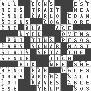 ACROSS 1. Everything 4. Immeasurably long periods of time 8. Eastern Standard Time (abbr.) 11. Vintage cars 13. Distinguishing feature 15. Teachers' org. 16. Southeast Asian peninsula 17. Monte _, Las Vegas Hotel/Casino 18. Dutch treat 19. Attaches a signature 21. Gear tooth 22. Old wives' tales, e.g. 23. Compass dir. 24. In the manner of 27. Adept person 29. Colored 30. Baking chambers 34. Luau course 36. Metal containers 39. Mexican monetary units 40. Hearing organs 41. Echolocation 43. Political cartoonist Thomas 44. Narrow boards 46. Stalk of a moss capsule 47. Third day of the wk. 48. Sir (Sp.) 49. Hankering 51. To free from 53. Born 54. A female animal or person 57. Monthly bill 60. Hearing organ 63. Stares at amorously 65. Mouths or openings 66. Scent 69. Table seasoning 70. Car dealer's back yard 71. All-night dance parties 72. Competent 73. Compass dir. 74. Sharp bark 75. Distress signal DOWN 1. Get up 2. Soviet premier 1918-24 3. Inn 4. And so on (abbr.) 5. Mouth or opening 6. Drug cop 7. Grain storage tower 8. Inside; within (prefix) 9. Scorch 10. Docile 12. Male child 14. Ancient Roman robe 18. Veterans Day date 20. Declare 25. Allows 26. Goodbye (Sp.) 28. Police officer (slang) 29. What propaganda does 31. Son of Isaac 32. Sense of smell 33. Fast jet (abbr.) 34. Light colored 35. Northwest Algerian city 37. Compass dir. 38. Smooth fabric 40. Curvy letter 42. Pace 45. _ Lanka 50. Corporate head (abbr.) 52. Letter starter 54. Thick slices 55. Phone greeting 56. _____ Park, CO 57. Hero or heavy, e.g. 58. Greek god of love 59. Nathan's nickname 61. Like ___ of sunshine 62. Be footloose 64. Girls' org. (abbr.) 67. Cartoonist voice _ Blanc 68. Viper
