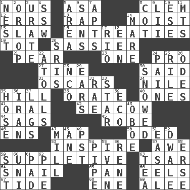 ACROSS 1. Good sense 5. White ___ sheet 8. Clement's nick name 12. Blunders 13. Strike 14. Damp 15. Cole _ (cabbage dish) 16. Pleas 19. Small child 20. More lively and spirited 21. Lightbulb-shaped fruit 23. Single 24. Adept person 27. Prong on a fork 30. Expressed in words 31. Motion picture awards 34. The longest river in the world 35. Land elevation 38. Speak pompously 40. Washington bills 41. Taken by mouth 42. Manatee 44. Settles 45. Loose flowing garment 46. Followers of ems 47. Atlas unit 50. Wrote a lyric poem 53. Heighten or intensify 57. Deep reverence 59. Supplying deficiencies 63. Russian ruler of old 64. Slow-paced one 65. Baking dish 66. Snakelike fish 67. Event that recurs at intervals 68. Compass dir. 69. Toward shelter DOWN 1. Egg locale 2. Lowest deck of a ship 3. A salt of uric acid 4. Compass dir. 5. Length times width 6. Without 7. Flats, for short 8. Small bed 9. Cards in a Roman deck? 10. Compass dir. 11. Mountains (abbr.) 14. Female horse 17. River (Sp.) 18. Car or cant ending 20. Indian titles of respect 22. Ringlike coral islands and reefs 24. Ache 25. Cause heat under the collar 26. Lyric poems 28. Non-commissioned officer (abbr.) 29. Hearing organs 30. Overwhelmed 32. Actress Charlotte 33. Play the lead 35. Flexible conduit 36. SW Asia republic 37. Fails to keep up a pace 39. Environmental prefix 43. Mitch Miller's instrument 47. Place where flour is made 48. A saturated hydrocarbon 49. Pacific Standard Time (abbr.) 51. Artist's stand 52. A sleeping potion; an opiate (poet.) 54. Corncob 55. _ the terrible 56. French philosopher Descartes 58. Celtic language 59. Fast jet (abbr.) 60. Single; one (prefix) 61. Groovy apt. 62. Sliced dessert 63. Beverage made from leaves