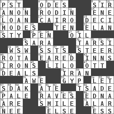 ACROSS 1. Pacific Standard Time (abbr.) 4. Lyric poems 8. Title for a knight 11. At once, immediately (arch.) 13. "The Thinker" sculptor 15. Compass dir. 16. Grant temporary use of 17. Capital of Egypt 18. Tenth: prefix 19. Methods 21. Nine, plus one 22. Liveliness 23. Filthy place 24. Animal enclosure 27. Petroleum 29. "Two Mules for Sister ____" 30. Tarsus (plural) 34. Compass dir. 36. Fast planes 39. Navigate 40. Roll call or roster of names 41. Having ears or earlike features 43. Taverns 44. Removes the wrinkles 46. _ and Stitch 47. Baseball player Mel 48. Allots cards 49. SW Asia republic 51. Deep reverence 53. Con 54. Allow 57. Neighbor of Neb. 60. Had dinner 63. Sadhe (variant) 65. Diluted with white 66. All-night dance parties 69. Pulitzer Prize-winning author Ferber 70. "We ___ not amused" (Victoria) 71. Grin 72. Having or resembling wings 73. Born 74. Otherwise 75. Curvy letter DOWN 1. Insides of hands 2. Snob 3. Sycophant 4. The grampus (Milton) 5. ___ good deed 6. Prepare for publication 7. Title for a man of rank and authority 8. Sew up the eyelids of hawks and falcons 9. South American Indian 10. It's straight from the horse's mouth 12. Compass dir. 14. Words to Nanette 18. Accusation by an informer 20. Health resort 25. Celtic language 26. Rhinal 28. It is 29. Tchaikovsky ballet 31. Monthly bill 32. Posted 33. Big collection agency 34. Had on 35. Portico 37. Three (prefix) 38. Former Milwaukee Brewers owner Bud 40. To free from 42. Dinghy 45. Compass dir. 50. Fitting 52. Hearing organs 54. Dipping utensil 55. Ferber et al. 56. Lacerates 57. Connect, as a bridge 58. Have the gumption 59. Toward shelter 61. Not wild 62. Tending to cause great harm 64. Ocean 67. Raised railways 68. Observe