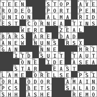 ACROSS 1. Adolescent 5. Constrict 9. "___ Maria" 12. Cowboy competition 14. Left side of a ship or aircraft 15. Writing instrument 16. The state of being joined or united 17. _ mater 18. To free from 19. Eastern Standard Time (abbr.) 20. Pupil covering 23. Airtight sealed metal containers 24. We are 25. Ardor 27. Soap units 30. "We ___ not amused" (Victoria) 32. Male parent 33. Afresh 34. Religious women 36. Acura sports coupe 38. Separate the seeds from cotton 39. Compass dir. 40. Medical imaging device (abbr.) 43. It would 46. Set of matching outer garments 48. Drawn tight 49. Single 51. Binary compound 52. At sea 53. Play the lead 54. 90 degrees 56. Unable to walk 58. Threatening words 61. 23rd letter of the Greek alphabet 64. Mouth or opening 65. Scent 66. At full speed 68. Personal Computers (abbr.) 69. Antes 70. Vegetable dish 71. Quiet! 72. American tennis player Robert 73. San ____ (Riviera town) DOWN 1. Loyal 2. Immeasurably long periods of time 3. Prepare for publication 4. Modern: prefix 5. Connect, as a bridge 6. Lacquered or enameled metalware 7. Chief deity of Zoroastrianism 8. Parent Teacher Assoc. 9. Showery time 10. Distinctive style or manner 11. Extremities 13. At one time in the past 21. NW Algerian seaport 22. Summer TV shows 23. Small boys 24. Compass dir. 26. Hearing organ 27. Paper or plastic container 28. Santa ___, CA 29. Painter Guido (1575-1642) 31. World-weariness 35. A glass for beer 37. Dec. holiday 41. Regret 42. Call ___ day 44. Carryall 45. Heredity factor (abbr.) 47. Beverages made from leaves 48. Make lace 50. Eats (away) 53. Box-office sellout 55. Oceans 56. Chops off 57. Bowlike part 59. Writer of Portnoy's Complaint (1969) 60. Celtic language 61. Diluted with white 62. Thailand, formerly 63. Southeast Asian peninsula 65. Chief or king in Benin or Nigeria 67. Third mo.