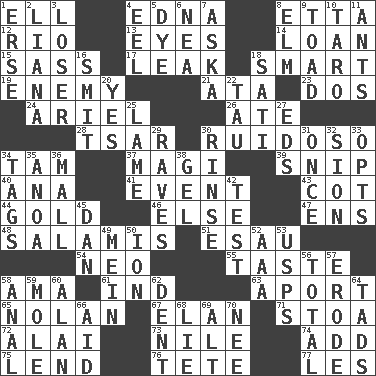 ACROSS 1. Pipe bend 4. Pulitzer Prize-winning author Ferber 8. Singer James 12. _ de Janeiro 13. Snake ____ (dice throw) 14. Grant temporary use of 15. Backtalk 17. Path through which fluid escapes 18. Don Adams' spy role 19. Foe 21. _ moment's notice (2 wds.) 23. Two (Sp.) 24. Satellite of Uranus 26. Had dinner 28. Russian ruler of old 30. Noisy, rowdy, vocal (Spanish) 34. Scottish cap 37. Wise men 39. Sever or remove by pinching or nipping 40. Santa ___, CA 41. Incident 43. Small bed 44. Aureate 46. Otherwise 47. Followers of ems 48. Deli grouping 51. Son of Isaac 54. Modern: prefix 55. Clothes sense 58. Nursemaid (var.) 61. Indiana (abbr.) 63. To the left, to Queeg 65. Pitcher Ryan 67. Enthusiasm 71. Portico 72. Jai ____ 73. "Death on the ____" 74. Increase 75. Grant temporary use of 76. Wig 77. French article DOWN 1. Celtic language 2. Climbing, woody, usually tropical vines 3. Failure 4. Snakelike fish 5. Color 6. Teachers' org. 7. "____ silly question..." 8. Shade tree 9. Frog relative 10. Edible starchy tuberous root 11. Pismires 16. Stricken, poetically 18. Suttee (variant) 20. Affirmative reply 22. The 19th letter of the Greek alphabet 25. Unable to walk 27. Begley and Asner 29. All-night dance parties 30. Remove soap 31. Single time 32. The Jewish people; Israel 33. Elects 34. Labels 35. Small Philippine buffalo 36. Promenade 38. Set 42. Trial 45. One of the 12 tribes of Israel 49. Chow _ 50. Electrically charged atom 52. American Automobile Association (abbr.) 53. United States Postal Service (abbr.) 56. Add up to 57. Eat (away) 58. Of or related to the anus 59. Undercover agent 60. ____ Jay Lerner 62. Gouge 64. Small amounts or degrees 66. Assist 68. Whopper 69. The first octave above the treble staff 70. Born