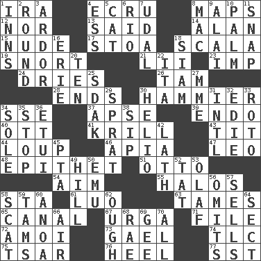 ACROSS 1. Retirement account (abbr.) 4. Shade of tan 8. Atlas contents 12. Not either 13. Stated 14. Actor Alda or Thicke 15. Naked 17. Portico 18. Any of the three canals of the cochlea 19. Derisive sound 21. Cards in a Roman deck? 23. Naughty child 24. Frees from moisture 26. Scottish cap 28. Conclusions 30. More given to overacting 34. Compass dir. 37. Domed church section 39. Inside; within (prefix) 40. Baseball player Mel 41. Shrimp-like planktonic crustaceans 43. Teat (slang) 44. Central Nebraska county 46. Capital of Western Samoa 47. Lion 48. Curse 51. "Beetle Bailey" pooch 54. Direct toward a target or goal 55. Radiant circles of light 58. R.R. building 61. Nilotic language 63. Softens 65. Lessep's creation 67. Capital and largest city of Mongolia 71. Do some clerical work 72. Mine, in Marseilles 73. Highlander 74. Affectionate concern, for short 75. Russian ruler of old 76. The bottom of a shoe or boot 77. Fast jet (abbr.) DOWN 1. Lodging establishments 2. Single shot of ammunition 3. Zeal 4. Curvy letter 5. Domesticated feline 6. River (Sp.) 7. Allodial 8. Apple computer (short form) 9. Mountain range southwest of Kyrgyzstan 10. Inside of hand 11. Fastener 16. 4th largest of the Great Lakes 18. Thailand, formerly 20. "___ Little Indians" 22. Call ___ day 25. Neighbor of Neb. 27. Madame (abbr.) 29. Small fatty European fish 30. Sun: prefix 31. International (abbr.) 32. Singer Brickell 33. Printing process, for short 34. Not divided or shared with others 35. Obstruct or block passage 36. Needle case 38. Small drink 42. Thin strip of wood or metal 45. Parent Teacher Assoc. 49. Land elevation 50. Australian flightless bird 52. Make lace 53. Norwegian king 56. Leaves out 57. Exchanges for money 58. Scram! 59. Scottish caps 60. Small Philippine buffalo 62. Ending for "Through" and "Enough" 64. Religious group 66. Atmosphere 68. Actress Charlotte 69. Unit of force equal to gravity 70. 100%